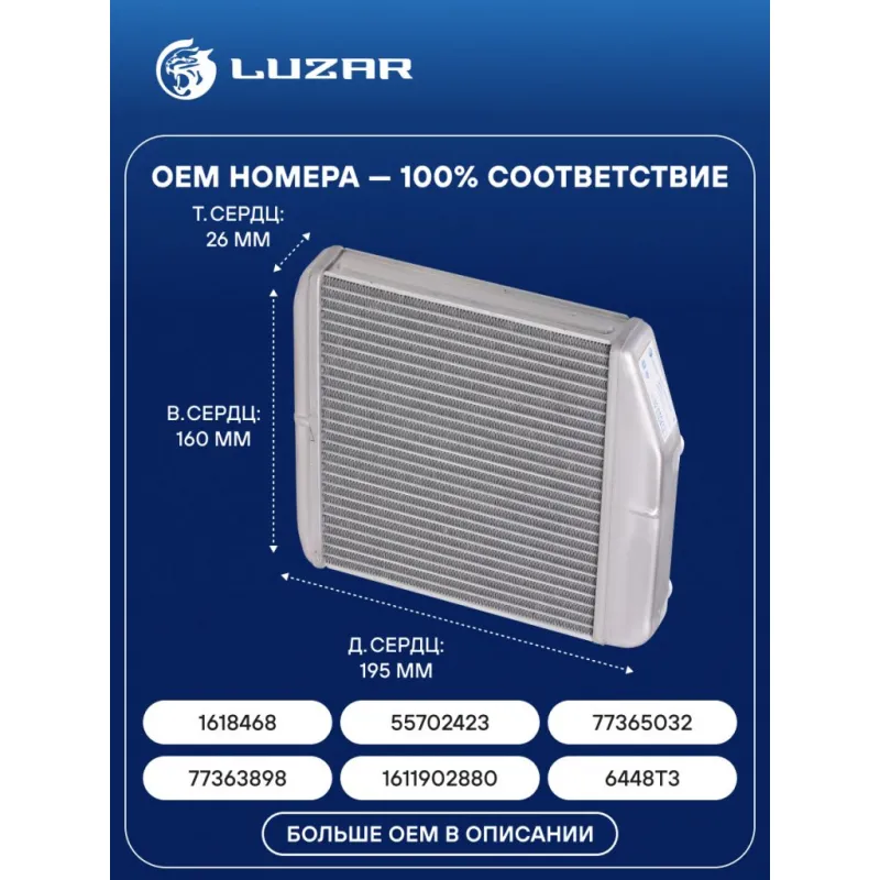 Радиатор отопителя для автомобилей Corsa D (07-) Характеристики: Артикул: LRh 2112 OEM номера: 1618468, 55702423, 77365032, 77363898, 1611902880, 6448T3, 39033120, 6448X8, 6448T8, 77364557, 77366860, 77365333, 77366932 Материал бачков: алюминий Тип сердцевины: паяная Трансмиссия: MT/AT Кондиционер: +/- Длина сердцевины, мм: 195 Высота сердцевины, мм: 160 Толщина сердцевины, мм: 26 Материал сердцевины: алюминий Сопутствующий товар: Электровентиляторы отопителя: LFh 2112 Сопутствующий товар: Элементы для уплотнения соединений: LGS 0030 Подходит для авто: Opel Corsa D (06-) Fiat Punto III (05-) Для проверки применяемости отправьте VIN автомобиля через вкладку "Есть вопросы о товаре?" Комплектация: Радиатор отопителя Паспорт изделия Гарантия: от 1 года.