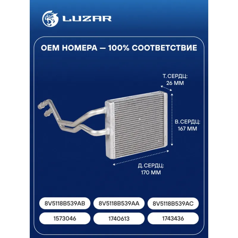 Радиатор отопителя для автомобилей Fiesta VI (08-) Характеристики: Артикул: LRh 1013 OEM номера: 1573046, 1743436, 8V5118B539AA, 1740613, 8V5118B539AB, 8V5118B539AC Трансмиссия: MT/AT Кондиционер: +/- Длина сердцевины, мм: 170 Высота сердцевины, мм: 167 Толщина сердцевины, мм: 26 Тип сердцевины: паяная Материал сердцевины: алюминий Тип конструкции: с трубками в сборе Сопутствующий товар: Электровентиляторы отопителя: LFh 1051 Подходит для авто: Ford Fiesta VI (08-) Для проверки применяемости отправьте VIN автомобиля через вкладку "Есть вопросы о товаре?" Комплектация: Радиатор отопителя Паспорт изделия Гарантия: от 1 года.
