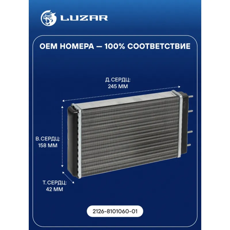 Радиатор отопителя для а/м ИЖ 2126 (сборный) Характеристики: Артикул: LRh 0226 OEM номера: 2126-8101060-01 Материал бачков: пластик Тип сердцевины: сборная Трансмиссия: MT Кондиционер: - Длина сердцевины, мм: 245 Высота сердцевины, мм: 158 Толщина сердцевины, мм: 42 Материал сердцевины: алюминий Подходит для авто: IZH 2126, 2127, 2717 Для проверки применяемости отправьте VIN автомобиля через вкладку "Есть вопросы о товаре?" Комплектация: Радиатор отопителя Паспорт изделия Гарантия: от 1 года.