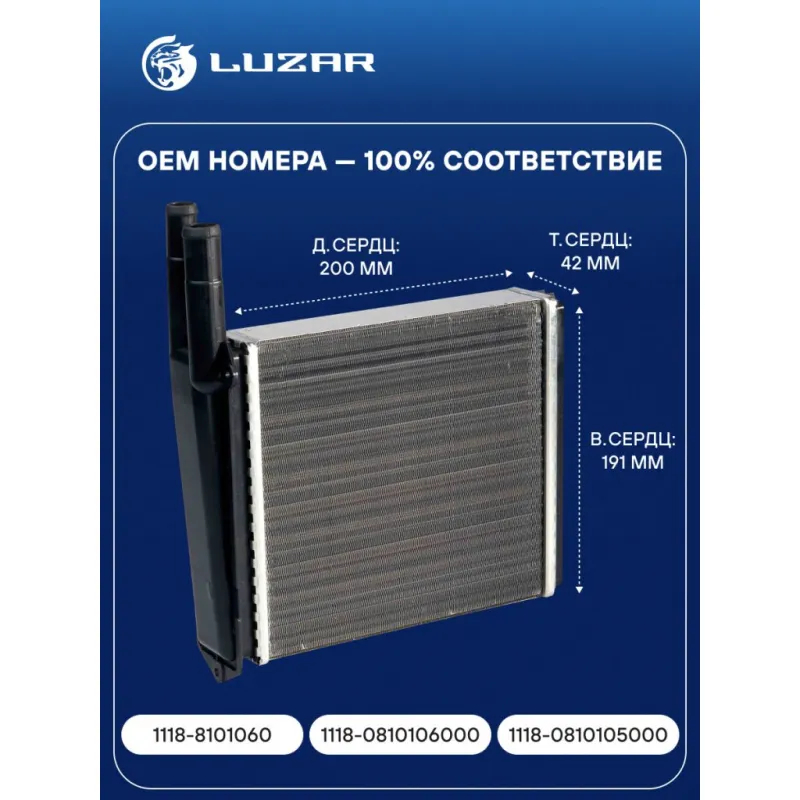 Радиатор отопителя для а/м Лада 1117-19 Калина (сборный) Характеристики: Артикул: LRh 0118 OEM номера: 1118-8101060, 1118-0810106000, 1118-0810105000 Трансмиссия: MT Кондиционер: - Длина сердцевины, мм: 200 Высота сердцевины, мм: 191 Толщина сердцевины, мм: 42 Тип сердцевины: сборная Материал сердцевины: алюминий Аналог: LRh 0117 (паяная сердцевина) Подходит для авто: ВАЗ Kalina (04-), Kalina (04-), Kalina (04-) Для проверки применяемости отправьте VIN автомобиля через вкладку "Есть вопросы о товаре?" Комплектация: Радиатор отопителя Паспорт изделия Гарантия: от 1 года.