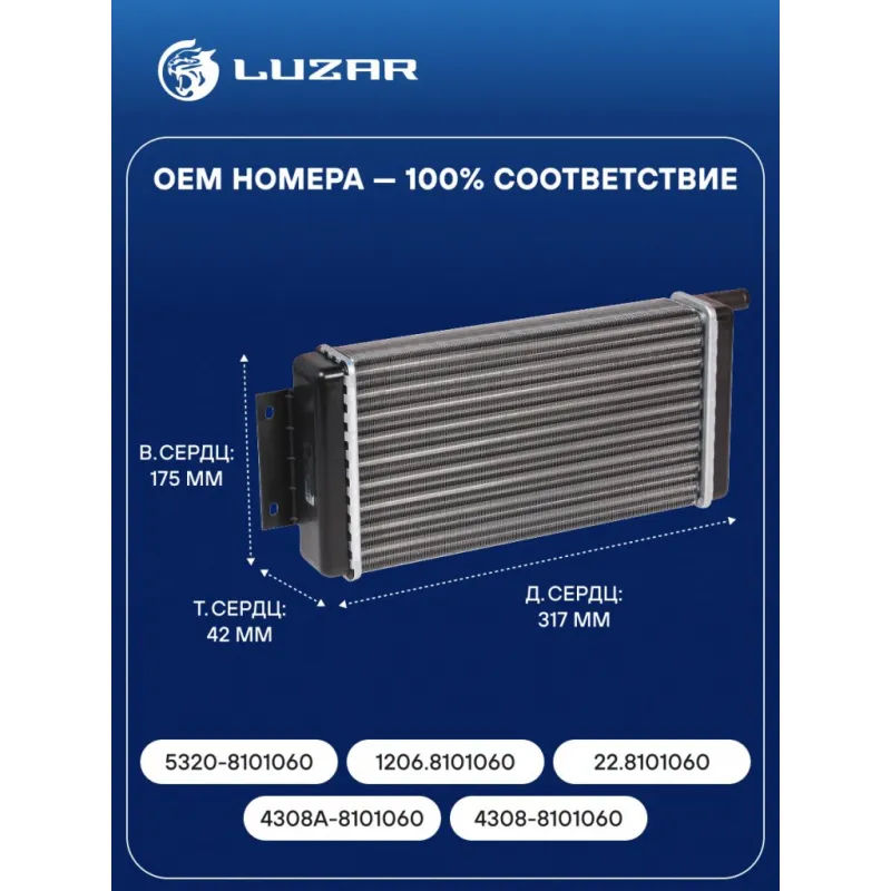Радиатор отопителя для а/м КAMAЗ (алюм.) (сборный) Характеристики: Артикул: LRh 0720 OEM номера: 5320-8101060, 1206.8101060, 22.8101060, 4308А-8101060, 4308-8101060 Трансмиссия: MT Кондиционер: - Материал сердцевины: алюминий Материал бачков: пластик Тип сердцевины: сборная Сопутствующий товар: Электровентиляторы отопителя: LFh 0790; LFh 0719 Сопутствующий товар: Бачки расширительные: LET 1570 Длина сердцевины, мм: 317 Толщина сердцевины, мм: 42 Высота сердцевины, мм: 175 Аналог: LRh 0723b (алюминиевая паяная сердцевина), LRh 0723 (медная сердцевина) Подходит для авто: КамаАЗ 65117, 6520, 5315, 5320, 53212, 54115, 55102, 55102, 5511, 55112, 55112, 6460, 6520, 6522, 65225 Для проверки применяемости отправьте VIN автомобиля через вкладку "Есть вопросы о товаре?" Комплектация: Радиатор отопителя Паспорт изделия Гарантия: от 1 года.