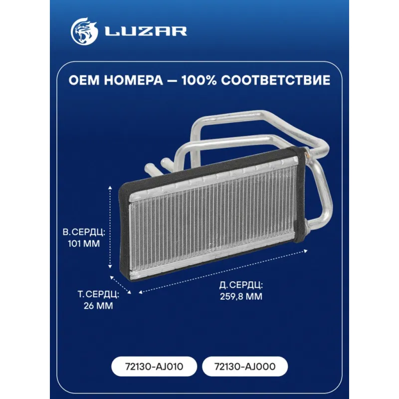 Радиатор отопителя для автомобилей Legacy (09-)/Outback (09-) Характеристики: Артикул: LRh 2209 OEM номера: 72130-AJ010, 72130-AJ000 Тип конструкции: с трубками в сборе Трансмиссия: MT/AT Кондиционер: +/- Материал сердцевины: алюминий Материал бачков: алюминий Тип сердцевины: паяная Длина сердцевины, мм: 259.8 Толщина сердцевины, мм: 26 Высота сердцевины, мм: 101 Подходит для авто: Subaru Legacy B14 (09-), Outback B14 (09-) Для проверки применяемости отправьте VIN автомобиля через вкладку "Есть вопросы о товаре?" Комплектация: Радиатор отопителя Паспорт изделия Гарантия: от 1 года.