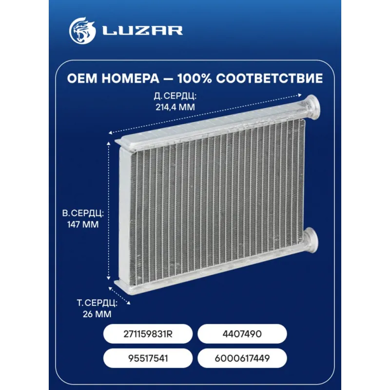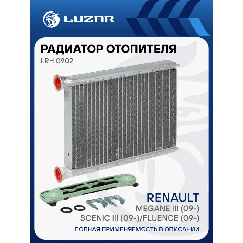 Радиатор отопителя для автомобилей Megane III (09-)/Scenic III (09-)/Fluence (09-) Характеристики: Артикул: LRh 0902 OEM номера: 271159831R, 4407490, 95517541, 6000617449 Трансмиссия: MT/AT Кондиционер: +/- Длина сердцевины, мм: 214.4 Высота сердцевины, мм: 147 Толщина сердцевины, мм: 26 Тип сердцевины: паяная Материал сердцевины: алюминий Комплектация: Клипсы, уплотнительные кольца Сопутствующий товар: Электровентиляторы отопителя: LFh 0902; LFh 0914 Подходит для авто: Renault Fluence (10-), Megane III (08-), Megane Scenic III (08-) Для проверки применяемости отправьте VIN автомобиля через вкладку "Есть вопросы о товаре?" Комплектация: Радиатор отопителя Клипсы - 2 шт Уплотнительные кольца - 2 шт Паспорт изделия Гарантия: от 1 года.