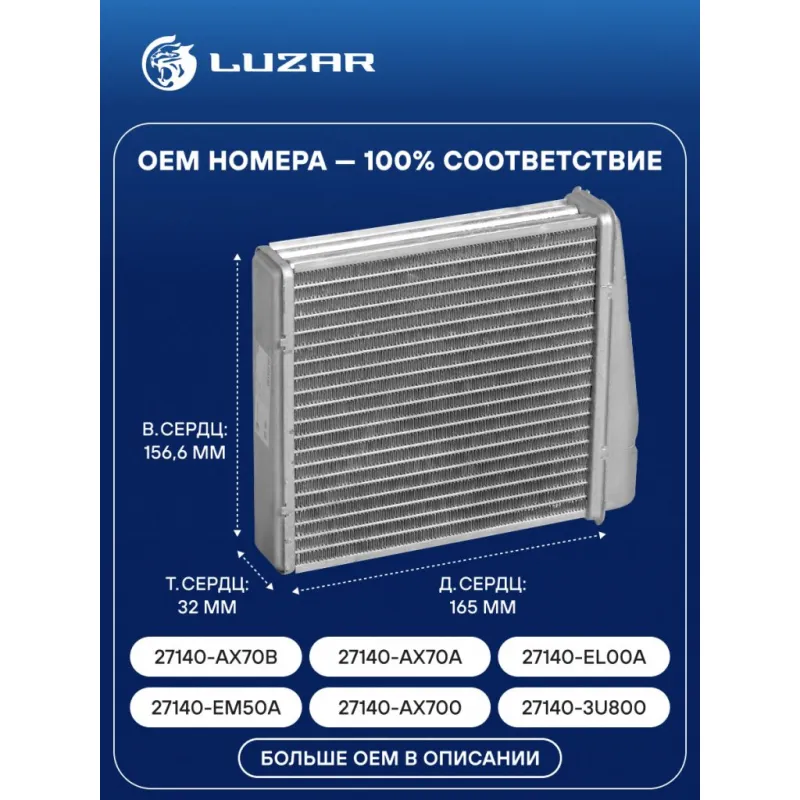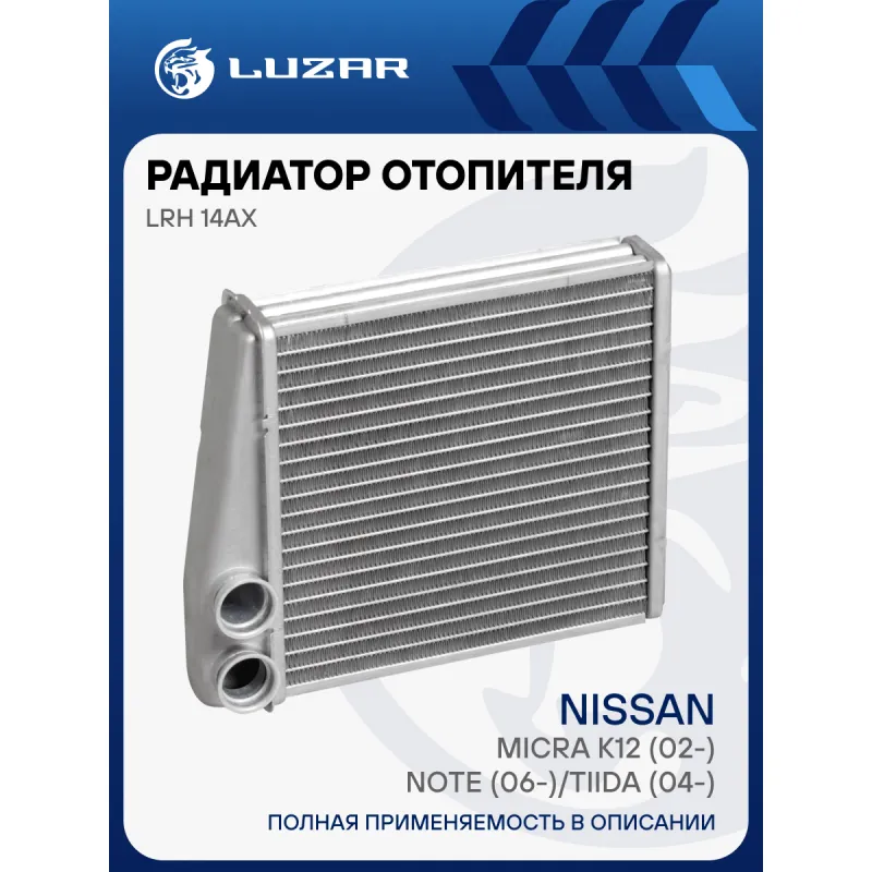 Радиатор отопителя для автомобилей Micra K12 (02-)/Note (06-)/Tiida (04-) Характеристики: Артикул: LRh 14AX OEM номера: 27140-AX70B, 27140-AX70A, 27140-EL00A, 27140-EM50A, 27140-AX700, 27140-3U800, 27140-AY50A, 27140-EM50B Трансмиссия: MT/AT Кондиционер: +/- Материал сердцевины: алюминий Материал бачков: алюминий Тип сердцевины: паяная Сопутствующий товар: Электровентиляторы отопителя: LFh 0991 Длина сердцевины, мм: 165 Толщина сердцевины, мм: 32 Высота сердцевины, мм: 156.6 Подходит для авто: Nissan Sentra (14-), Cube II (02-), Note (06-), Micra K12 (02-), Tiida (04-) Renault Clio III (05-), Modus (02-) Для проверки применяемости отправьте VIN автомобиля через вкладку "Есть вопросы о товаре?" Комплектация: Радиатор отопителя Паспорт изделия Гарантия: от 1 года.