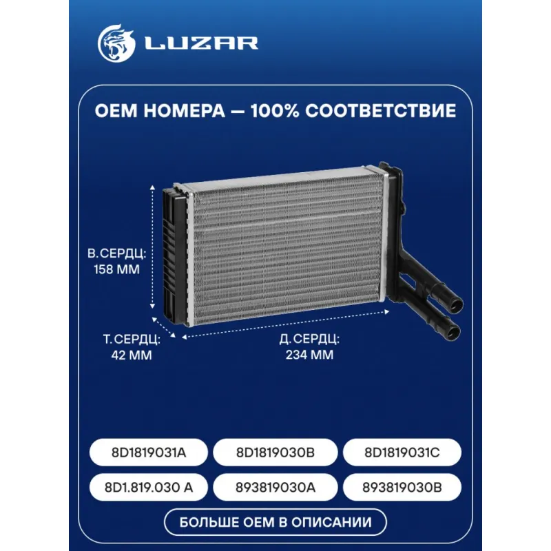Радиатор отопителя для автомобилей Passat B5 (96-) Характеристики: Артикул: LRh 181DP OEM номера: 8D1819031A, 8D1819030B, 8D1819031C, 8D1.819.030 A, 893819030A, 893819030B, 8D1819030C Трансмиссия: MT/AT Кондиционер: +/- Материал сердцевины: алюминий Материал бачков: пластик Тип сердцевины: сборная Сопутствующий товар: Электровентиляторы отопителя: LFh 0991; LFh 1800; LFh 1802; LFh 1812; LFh 18D1; LFh 18K1 Длина сердцевины, мм: 234 Толщина сердцевины, мм: 42 Высота сердцевины, мм: 158 Подходит для авто: Volkswagen Passat B5 (96-) Audi A4 B5 (94-), A6 C5 (97-) Skoda Superb I (01-) Для проверки применяемости отправьте VIN автомобиля через вкладку "Есть вопросы о товаре?" Комплектация: Радиатор отопителя Паспорт изделия Гарантия: от 1 года.