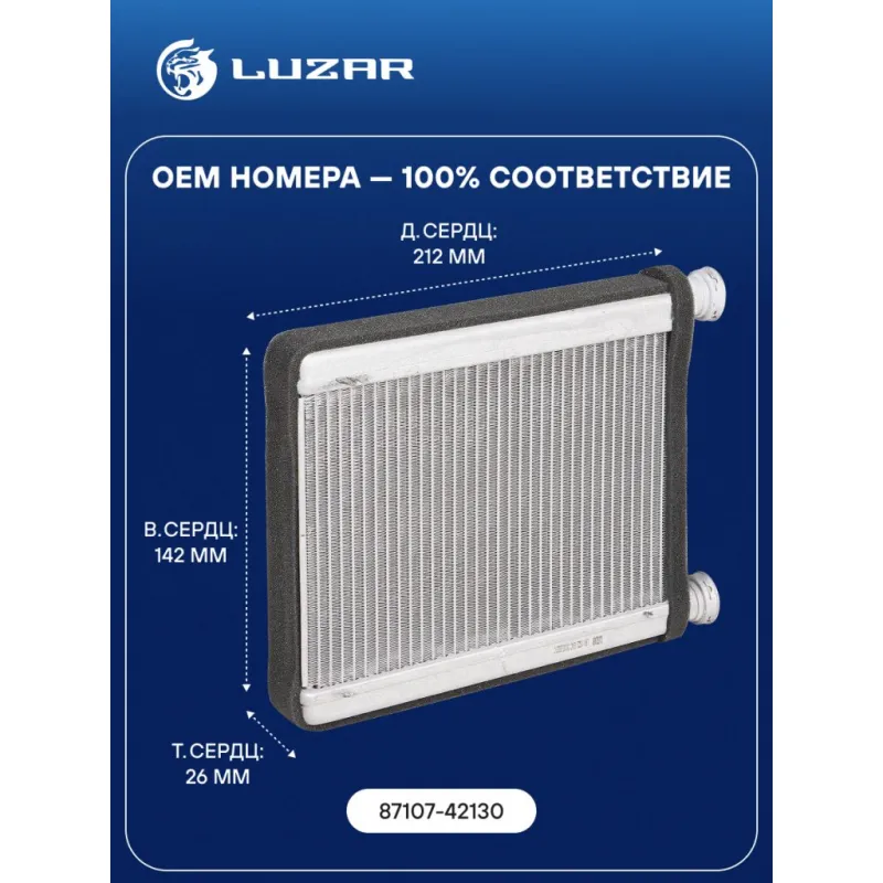 Радиатор отопителя для автомобилей RAV4 (00-) Характеристики: Артикул: LRh 1922 OEM номера: 87107-42130 Материал бачков: алюминий Трансмиссия: MT/AT Кондиционер: +/- Длина сердцевины, мм: 212 Высота сердцевины, мм: 142 Толщина сердцевины, мм: 26 Тип сердцевины: паяная Материал сердцевины: алюминий Комплектация: уплотнительные кольца - 2шт. Подходит для авто: Toyota RAV 4 (00-), RAV 4 (00-) Для проверки применяемости отправьте VIN автомобиля через вкладку "Есть вопросы о товаре?" Комплектация: Радиатор отопителя Паспорт изделия Уплотнительные кольца - 2 шт Гарантия: от 1 года.