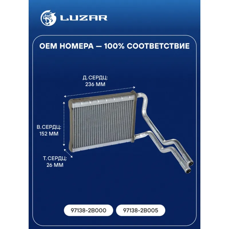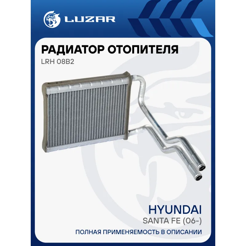 Радиатор отопителя для автомобилей Santa Fe (06-) Характеристики: Артикул: LRh 08B2 OEM номера: 97138-2B000, 97138-2B005 Тип сердцевины: паяная Трансмиссия: MT/AT Кондиционер: +/- Длина сердцевины, мм: 236 Высота сердцевины, мм: 152 Толщина сердцевины, мм: 26 Материал сердцевины: алюминий Подходит для авто: Hyundai Santa Fe II (06-) Для проверки применяемости отправьте VIN автомобиля через вкладку "Есть вопросы о товаре?" Комплектация: Радиатор отопителя Паспорт изделия Гарантия: от 1 года.