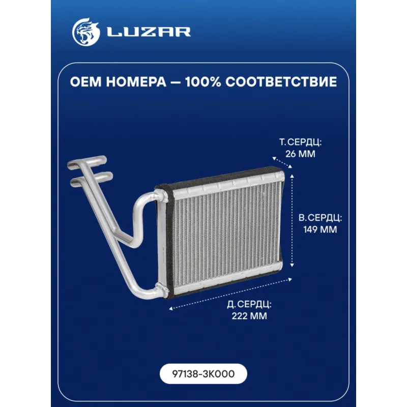 Радиатор отопителя для автомобилей Sonata (05-)/Grandeur (05-) Характеристики: Артикул: LRh 0815 OEM номера: 97138-3K000 Трансмиссия: MT/AT Кондиционер: +/- Длина сердцевины, мм: 222 Высота сердцевины, мм: 149 Толщина сердцевины, мм: 26 Тип сердцевины: паяная Материал сердцевины: алюминий Тип конструкции: с трубками в сборе Сопутствующий товар: Электровентиляторы отопителя: LFh 08Y0 Подходит для авто: Hyundai Sonata V (NF) (05-), Sonata V (NF) (05-), Grandeur (05-) Для проверки применяемости отправьте VIN автомобиля через вкладку "Есть вопросы о товаре?" Комплектация: Радиатор отопителя Паспорт изделия Гарантия: от 1 года.