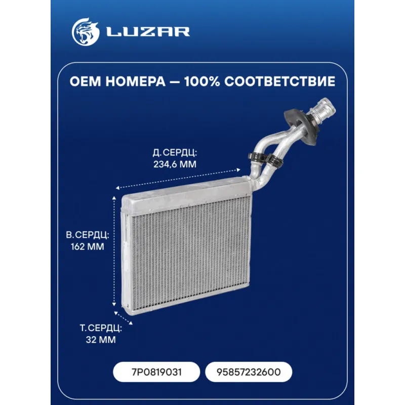 Радиатор отопителя для автомобилей Touareg II (10-)/Cayenne II (10-) Характеристики: Артикул: LRh 1885 OEM номера: 7P0819031, 95857232600 Трансмиссия: MT/AT Кондиционер: +/- Длина сердцевины, мм: 234.6 Высота сердцевины, мм: 162 Толщина сердцевины, мм: 32 Тип сердцевины: паяная Материал сердцевины: алюминий Тип конструкции: со съемными трубками Комплектация: трубки, фиксаторы трубок, защитная пластиковая накладка Сопутствующий товар: Электровентиляторы отопителя: LFh 1858 Подходит для авто: Volkswagen Touareg II (10-) Porsche Cayenne II (10-) Для проверки применяемости отправьте VIN автомобиля через вкладку "Есть вопросы о товаре?" Комплектация: Радиатор отопителя Паспорт изделия Трубки - 2 шт Фиксаторы трубок - 2 шт Гарантия: от 1 года.
