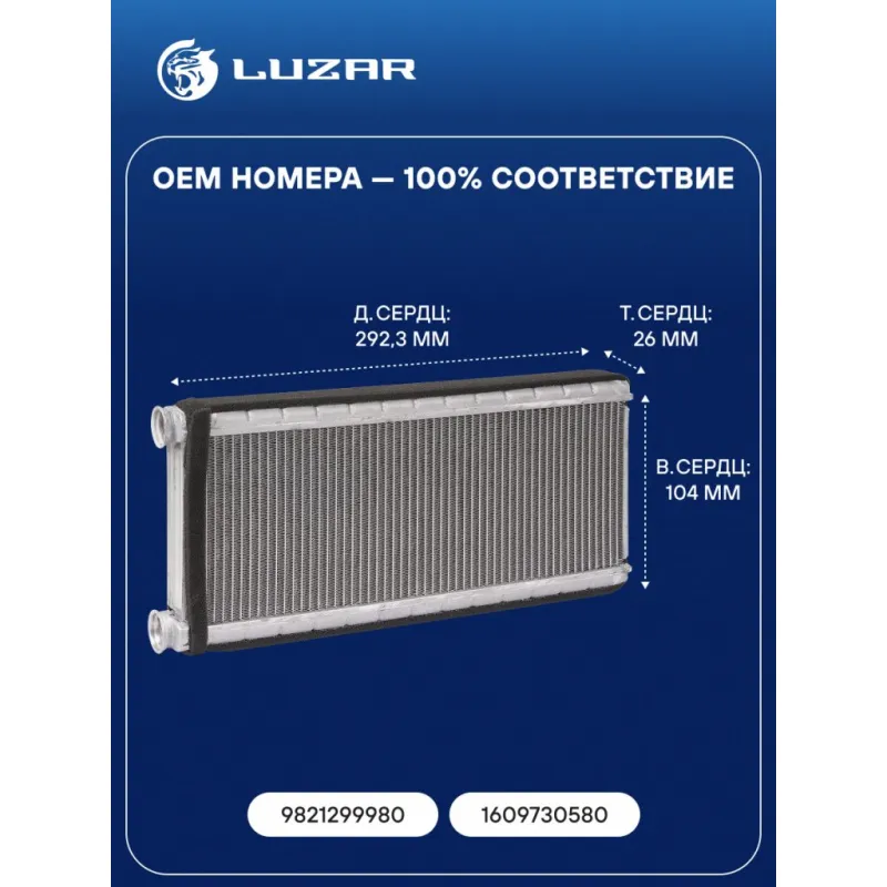 Радиатор отопителя для а/м Peugeot Traveller (16-)/Citroen Jumpy (16-)/SpaceTourer (16-) (передний) Характеристики: Артикул: LRh 2005 OEM номера: 9821299980, 1609730580 Трансмиссия: MT/AT Кондиционер: +/- Комплектация: фиксаторы, уплотнительные кольца Материал сердцевины: алюминий Материал бачков: алюминий Тип сердцевины: паяная Сопутствующий товар: Элементы для уплотнения соединений: LGS 0030 Длина сердцевины, мм: 292,3 Толщина сердцевины, мм: 26 Высота сердцевины, мм: 104 Подходит для авто: Citroen C4 Picasso (13-), C4 Picasso (13-), Jumpy III (16-), SpaceTourer (16-) Peugeot Traveller (16-), 3008 II (16-), Expert III (16-) Opel Vivaro C (19-) Для проверки применяемости отправьте VIN автомобиля через вкладку "Есть вопросы о товаре?" Комплектация: Радиатор отопителя - 1 шт Паспорт изделия - 1 шт Фиксаторы - 2 шт Уплотнительные кольца - 2 шт Гарантия: от 1 года.