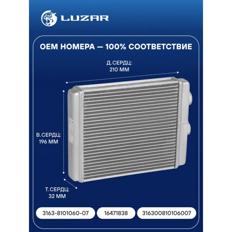 Радиатор отопителя для автомобилей УАЗ 3163 Патриот (06.2007-04.2012) (тип Delphi) Характеристики: Артикул: LRh 03637 OEM номера: 3163-8101060-07, 16471838, 316300810106007 Трансмиссия: MT Кондиционер: +/- Материал сердцевины: алюминий Материал бачков: алюминий Тип сердцевины: паяная Длина сердцевины, мм: 210 Толщина сердцевины, мм: 32 Высота сердцевины, мм: 196 Подходит для авто: УАЗ Patriot (08-), 31631 Для проверки применяемости отправьте VIN автомобиля через вкладку "Есть вопросы о товаре?" Комплектация: Радиатор отопителя Паспорт изделия Гарантия: от 1 года.