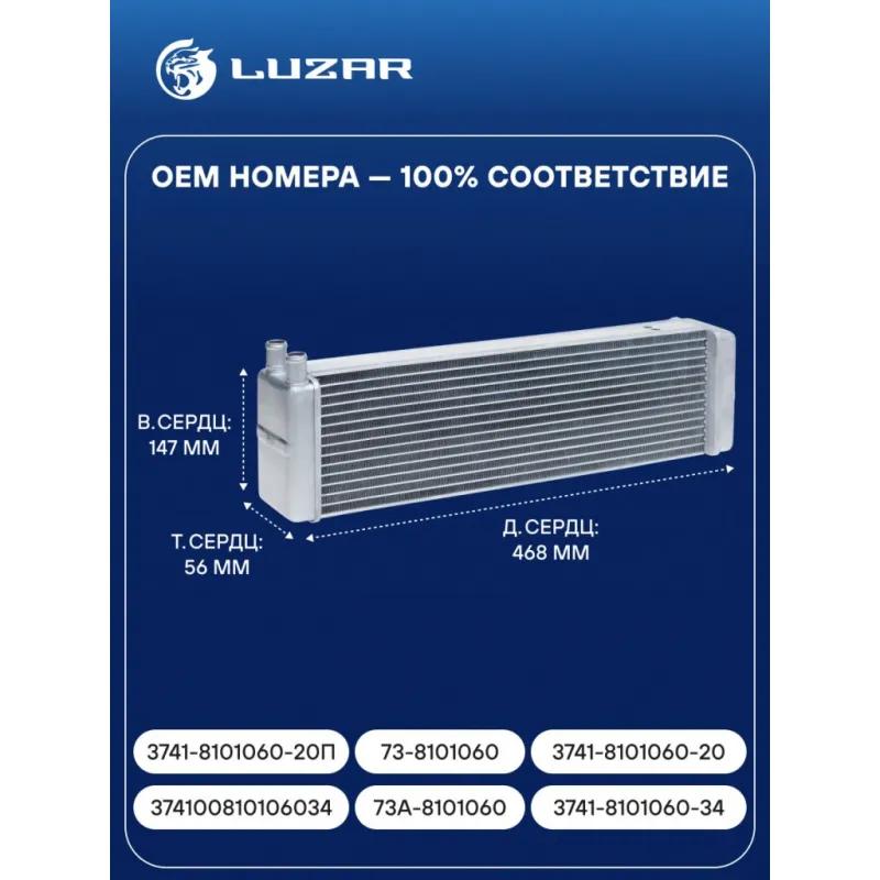 Радиатор отопителя для а/м УАЗ 3741/469/3151 (20мм) Характеристики: Артикул: LRh 03470b OEM номера: 3741-8101060-20П, 3741-8101060-20, 3741-8101060-34, 374100810106034, 73А-8101060, 73-8101060 Тип сердцевины: паяная Трансмиссия: MT Кондиционер: - Длина сердцевины, мм: 468 Высота сердцевины, мм: 147 Толщина сердцевины, мм: 56 Материал сердцевины: алюминий Диаметр патрубков: 20мм Подходит для авто: УАЗ 3151 (85-), 3303, 3741, 3909, 3962, 469 (72-), 452, 3151 (85-), 3303, 3741, 3909, 3962, 469 (72-), 452, Hunter (УАЗ-315195) (03-) Для проверки применяемости отправьте VIN автомобиля через вкладку "Есть вопросы о товаре?" Комплектация: Радиатор отопителя Паспорт изделия Гарантия: от 1 года.