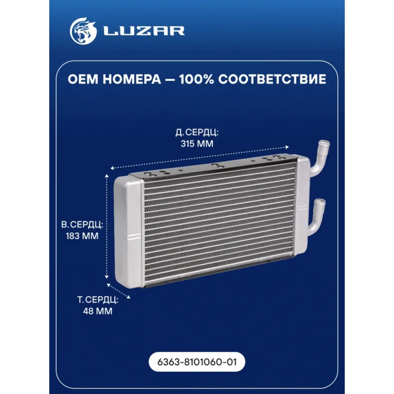 Радиатор отопителя для автомобилей Урал 3255/4320/5323/6323 Характеристики: Артикул: LRh 1209 OEM номера: 6363-8101060-01 Материал бачков: алюминий Тип сердцевины: паяная Трансмиссия: MT Кондиционер: - Длина сердцевины, мм: 315 Высота сердцевины, мм: 183 Толщина сердцевины, мм: 48 Материал сердцевины: алюминий Подходит для авто: Ural 4420, 5557, 5323, 6370, 6470, 63674, 3255, 4320 Для проверки применяемости отправьте VIN автомобиля через вкладку "Есть вопросы о товаре?" Комплектация: Радиатор отопителя Паспорт изделия Гарантия: от 1 года.