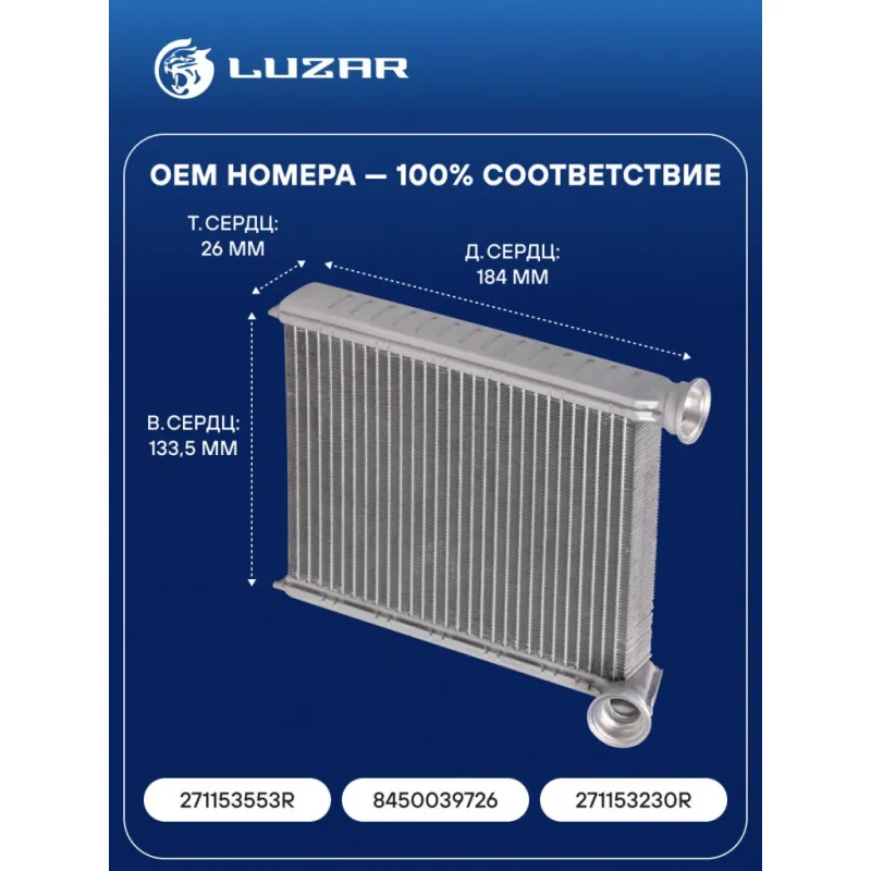 Радиатор отопителя для автомобилей Vesta (15-)/Logan II (12-)/Kaptur (16-) Характеристики: Артикул: LRh 0978 OEM номера: 271153553R, 8450039726, 271153230R Трансмиссия: MT/AT Кондиционер: +/- Комплектация: уплотнительные кольца + металл. фиксаторы Материал сердцевины: алюминий Материал бачков: алюминий Тип сердцевины: паяная Сопутствующий товар: Электровентиляторы отопителя: LFh 0978; LFh 0980 Сопутствующий товар: Патрубки отопления (комплект): LPKh 0180, LPKh 0181, LPKh 0978 Сопутствующий товар: Элементы для уплотнения соединений: LGS 0005 Длина сердцевины, мм: 184 Толщина сердцевины, мм: 26 Высота сердцевины, мм: 133.5 Подходит для авто: Renault Kaptur (16-), Arkana (19-), Duster II (21-), Logan II (12-), Sandero II (14-) ВАЗ Vesta (15-), Vesta (15-), X-Ray (15-) Для проверки применяемости отправьте VIN автомобиля через вкладку "Есть вопросы о товаре?" Комплектация: Радиатор отопления Паспорт изделия Уплотнительные кольца - 2 шт Фиксаторы - 2 шт Гарантия: от 1 года.