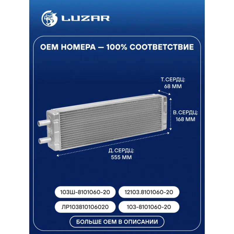 Радиатор отопителя (фронтального) для автомобилей МАЗ 103/105 (07-) (алюминиевый, с краном) Характеристики: Артикул: LRh 1203 OEM номера: 103Ш-8101060-20, 12103.8101060-20, ЛР103810106020М, ЛР103810106020, 103-8101060-20 Материал бачков: алюминий Тип сердцевины: паяная Трансмиссия: MT/AT Кондиционер: +/- Длина сердцевины, мм: 555 Высота сердцевины, мм: 168 Толщина сердцевины, мм: 68 Материал сердцевины: алюминий Подходит для авто: МАЗ 103, 104, 107, 105 Для проверки применяемости отправьте VIN автомобиля через вкладку "Есть вопросы о товаре?" Комплектация: Радиатор отопителя Паспорт изделия Гарантия: от 1 года.