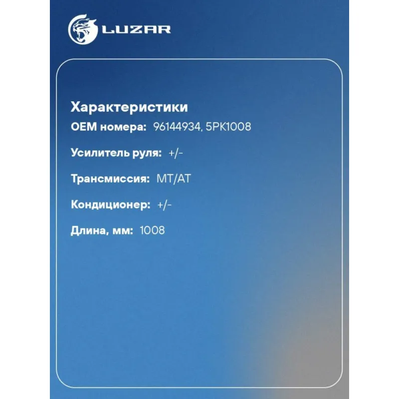 Ремень приводной для автомобилей Daewoo Nexia (94-) DOHC Характеристики: Артикул: LB 0547 OEM номера: 96144934, 5PK1008 Усилитель руля: +/- Количество на автомобиль: 1 Трансмиссия: MT/AT Кондиционер: +/- Длина, мм: 1008 Количество ребер: 5 Подходит для авто: Daewoo Nexia (94-), Lanos (97-), Nexia new (08-) Chevrolet Lanos (97-) Для проверки применяемости отправьте VIN автомобиля через вкладку "Есть вопросы о товаре?" Комплектация: Ремень генератора Гарантия: от 1 года.