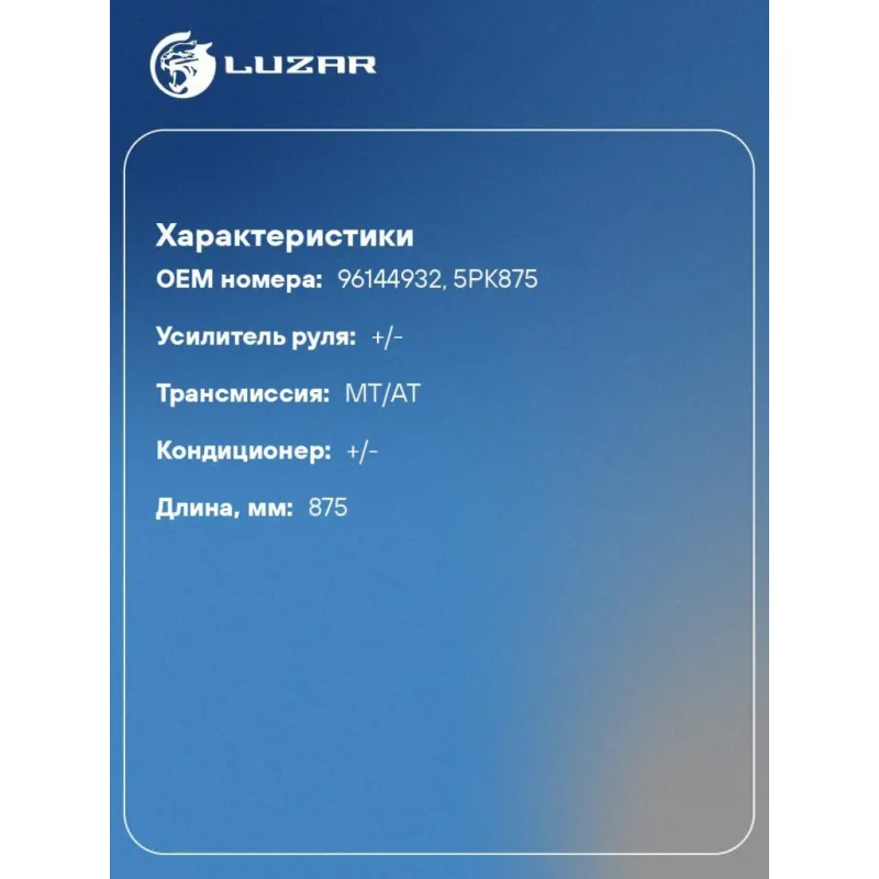 Ремень приводной для автомобилей Daewoo Nexia (94-)/Lanos (97-) Характеристики: Артикул: LB 0548 OEM номера: 96144932, 5PK875 Усилитель руля: +/- Количество на автомобиль: 1 Трансмиссия: MT/AT Кондиционер: +/- Длина, мм: 875 Количество ребер: 5 Подходит для авто: ЗАЗ Chance (09-) Daewoo Nexia (94-), Lanos (97-), Nexia new (08-) Chevrolet Lanos (97-) Для проверки применяемости отправьте VIN автомобиля через вкладку "Есть вопросы о товаре?" Комплектация: Ремень генератора Гарантия: от 1 года.