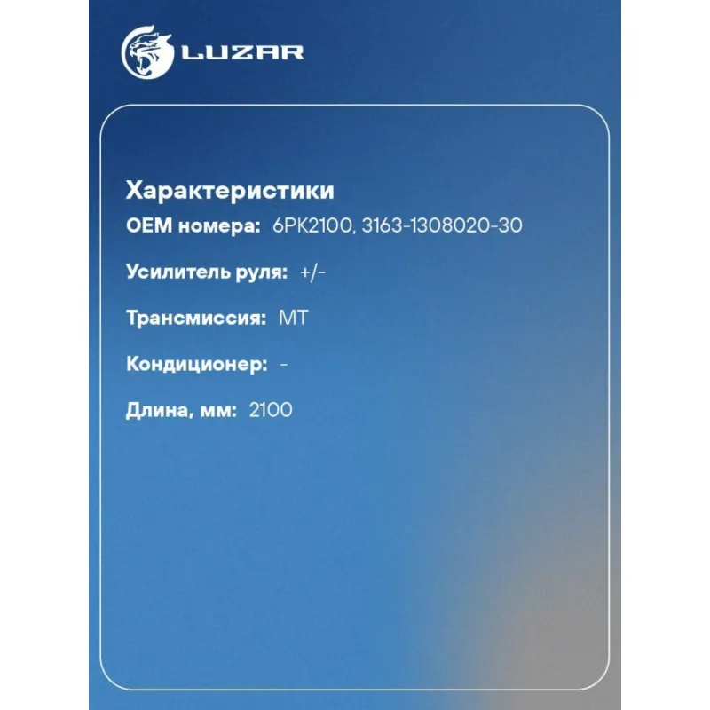 Ремень приводной для автомобилей УАЗ Патриот A/C+ Характеристики: Артикул: LB 03631 OEM номера: 6PK2100, 3163-1308020-30 Усилитель руля: +/- Количество на автомобиль: 1 Трансмиссия: MT Кондиционер: - Длина, мм: 2100 Количество ребер: 6 Подходит для авто: УАЗ 3160 (97-), 3151 (85-), Hunter (УАЗ-315195) (03-), 3162 (00-), Patri... Читать полностью →