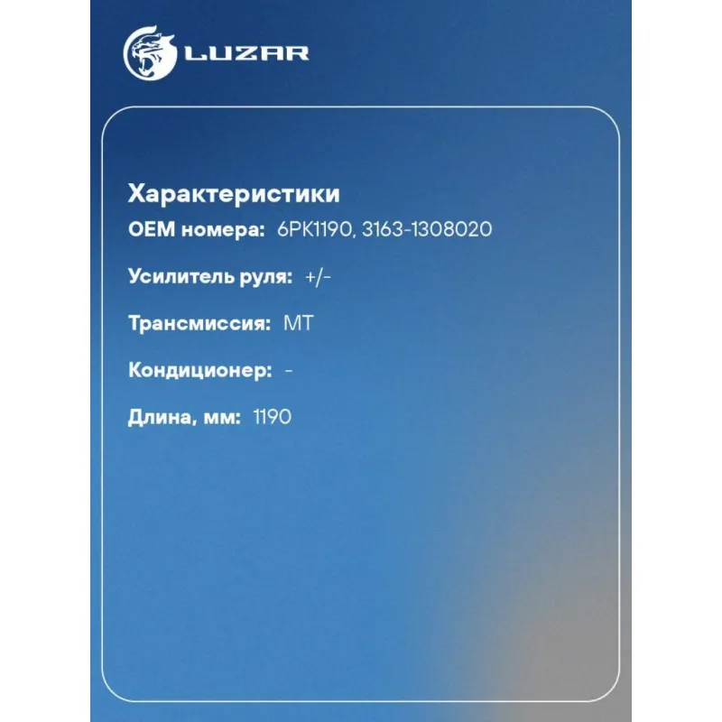 Ремень приводной для автомобилей УАЗ Патриот Характеристики: Артикул: LB 0363 OEM номера: 6PK1190, 3163-1308020 Усилитель руля: +/- Количество на автомобиль: 1 Трансмиссия: MT Кондиционер: - Длина, мм: 1190 Количество ребер: 6 Подходит для авто: УАЗ 3160 (97-), 3151 (85-), Hunter (УАЗ-315195) (03-), 3162 (00-), Patriot (08-) Для проверки применяемости отправьте VIN автомобиля через вкладку "Есть вопросы о товаре?" Комплектация: Ремень генератора Гарантия: от 1 года.