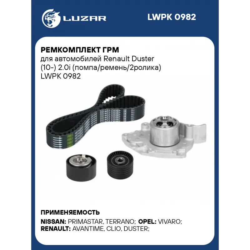 Ремкомплект ГРМ для автомобилей Renault Duster (10-) 2.0i (помпа/ремень/2ролика) Характеристики: Артикул: LWPK 0982 OEM номера: 130284231R, MW31303112, 1307000QAF, 13077-00QAB, 13070 00Q0L, 13070-00QAA, 1307000Q0B, 1307000Q0C, 1307000Q0H, 1307000Q1D, A3070-00Q0A, 2101000Q0K, 4416576, 4412355, 93161016, 91159999, 4408028, 130706246R, 130775630R, 7701064316, 7700108920, 7700114860, 8200045127, 7701479043, 8200676404, 8200221695, 8200222092, 8200499909, 7701472182, 8660003255, 8200046148, 8200061345, 7700107150, 8200989169, 8200989172, 8201058069, 4408392, 4409959, 4430896, 4433629, 4449588, 4452597, 93188702, 93161482, 93198125, 93198653, 93160130, 31303112, 8200542739, 11 93 162 59R, 91159773 Количество на автомобиль: 1 Комплектация: Насос водяной - 1 шт Ролик ГРМ - 2 шт Ремень ГРМ - 1 шт Гарантия: от 1 года.