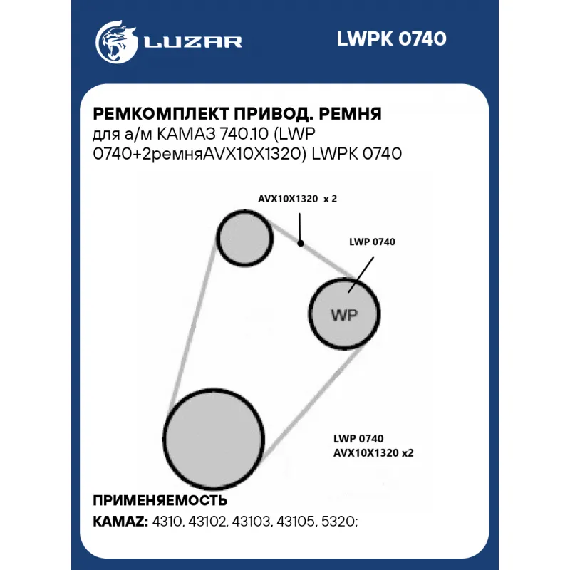 Ремкомплект привод. ремня для а/м КАМАЗ 740.10 (LWP 0740+2ремняAVX10X1320) Характеристики: Артикул: LWPK 0740 OEM номера: 740-1307010-02 Количество на автомобиль: 1 Комплектация: Насос водяной Прокладка уплотнительная Паспорт изделия Ремень приводной - 2 шт Гарантия: от 1 года.