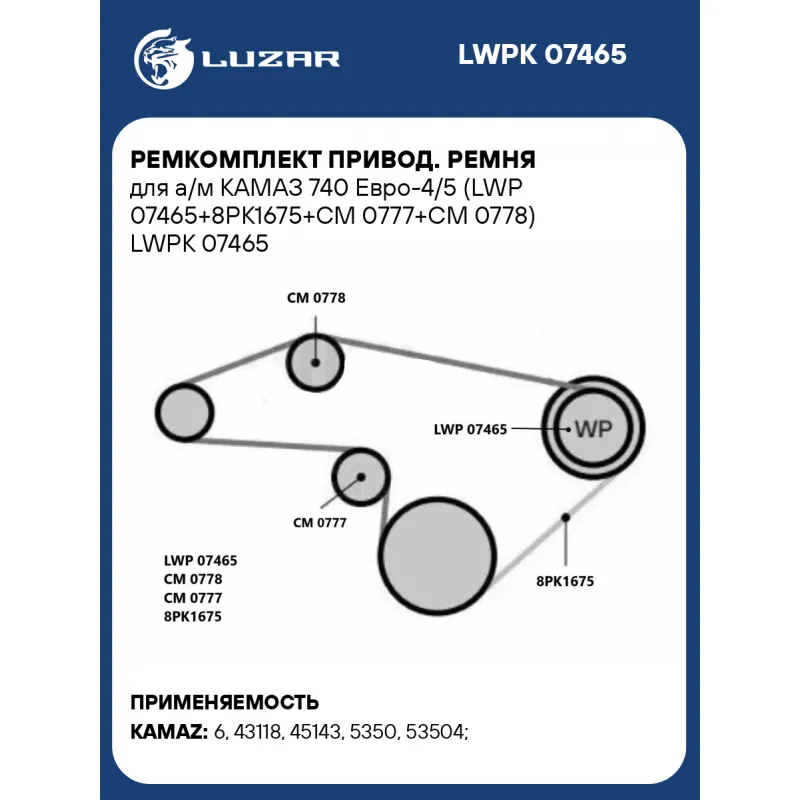 Ремкомплект привод. ремня для а/м КАМАЗ 740 Евро-4/5 (LWP 07465+8PK1675+CM 0777+CM 0778) Характеристики: Артикул: LWPK 07465 OEM номера: 750.10-1307010, 3937553, 3917485, 3934818, 3914086, 2686-01, 26816-01, 26900-21 Количество на автомобиль: 1 Комплектация: Насос водяной Прокладка уплотнительная Паспорт изделия Ролик приводного ремня - 2 шт Ремень приводной Гарантия: от 1 года.