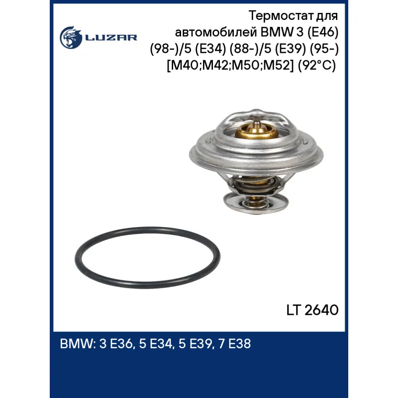 Термостат для автомобилей BMW 3 (E46) (98-)/5 (E34) (88-)/5 (E39) (95-) [M40;M42;M50;M52] (92°С) (термоэлемент) Характеристики: Артикул: LT 2640 OEM номера: 11537511083, 11531733803, 11531265084, 11531468057 Трансмиссия: MT/AT Кондиционер: +/- Количество на автомобиль: 1 Температура открытия, ?С: 92 Двигатель: [M40; M42; M50; M52] Комплектация: уплотнительная прокладка Подходит для авто: BMW 3 E36 (90-), 5 E34 (88-), 5 E39 (95-), 7 E38 (94-) Для проверки применяемости отправьте VIN автомобиля через вкладку "Есть вопросы о товаре?" Комплектация: термостат - 1 шт Паспорт изделия - 1 шт Уплотнительная прокладка - 1 шт Гарантия: от 1 года.