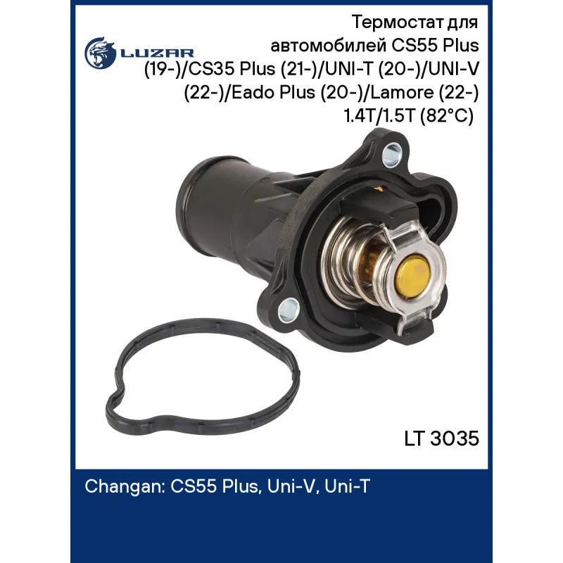 Термостат для автомобилей CS55 Plus (19-)/CS35 Plus (21-)/UNI-T (20-)/UNI-V (22-)/Eado Plus (20-)/Lamore (22-) 1.4T/1.5T (82°С) (с корпусом) Характеристики: Артикул: LT 3035 OEM номера: NE14T0010140, NE14T0030340, NE14T0030330 Трансмиссия: AT Кондиционер: + Количество на автомобиль: 1 Температура открытия, ?С: 82 Комплектация: уплотнительная прокладка Материал корпуса: пластик Основной клапан: обрезиненный Подходит для авто: Changan CS55 Plus (21-), Uni-V (22-), Uni-T (20-), CS35 Plus (21-), Eado Plus (20-), Lamore (22-) Для проверки применяемости отправьте VIN автомобиля через вкладку "Есть вопросы о товаре?" Комплектация: термостат - 1 шт Паспорт изделия - 1 шт Уплотнительная прокладка - 1 шт Гарантия: от 1 года.