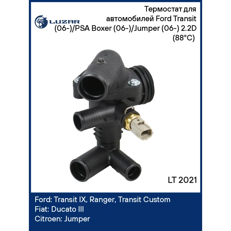 Термостат для автомобилей Ford Transit (06-)/PSA Boxer (06-)/Jumper (06-) 2.2D (88°C) (с корпусом) Характеристики: Артикул: LT 2021 OEM номера: 9678741380, BK2Q8A586AB, 1731770 Трансмиссия: MT Кондиционер: + Количество на автомобиль: 1 Температура открытия, ?С: 88 Материал корпуса: пластик Подходит для авто: Ford Transit IX (13-), Ranger (06-), Transit Custom (12-), Tourneo Custom (12-), Mondeo III (00-), Transit VI (00-), Transit VII (06-) Fiat Ducato III (06-) Citroen Jumper (06-) Peugeot Boxer (06-) Для проверки применяемости отправьте VIN автомобиля через вкладку "Есть вопросы о товаре?" Комплектация: термостат - 1 шт Паспорт изделия - 1 шт Гарантия: от 1 года.