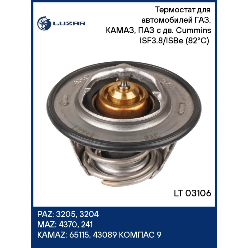 Термостат для автомобилей ГАЗ, КАМАЗ, ПАЗ с дв. Cummins ISF3.8/ISBe (82°C) (термоэлемент) Характеристики: Артикул: LT 03106 OEM номера: 4929642, 5292708, 3973834, 3974823, 5337966F Количество на автомобиль: 1 Трансмиссия: MT Температура открытия, ?С: 82 Кондиционер: +/- Комплектация: уплотнительная прокладка Основной клапан: обрезиненный Подходит для авто: ПАЗ 3205, 3204 МАЗ 4370, 241 КамаАЗ 65115, 43089 КОМПАС 9, 43082 КОМПАС 12 ЛиАЗ 5256, 5293 JAC N75, N90, N120, N80 ГАЗ Valday, 33106 Для проверки применяемости отправьте VIN автомобиля через вкладку "Есть вопросы о товаре?" Комплектация: термостат - 1 шт Уплотнительная прокладка - 1 шт Паспорт изделия - 1 шт Гарантия: от 1 года.
