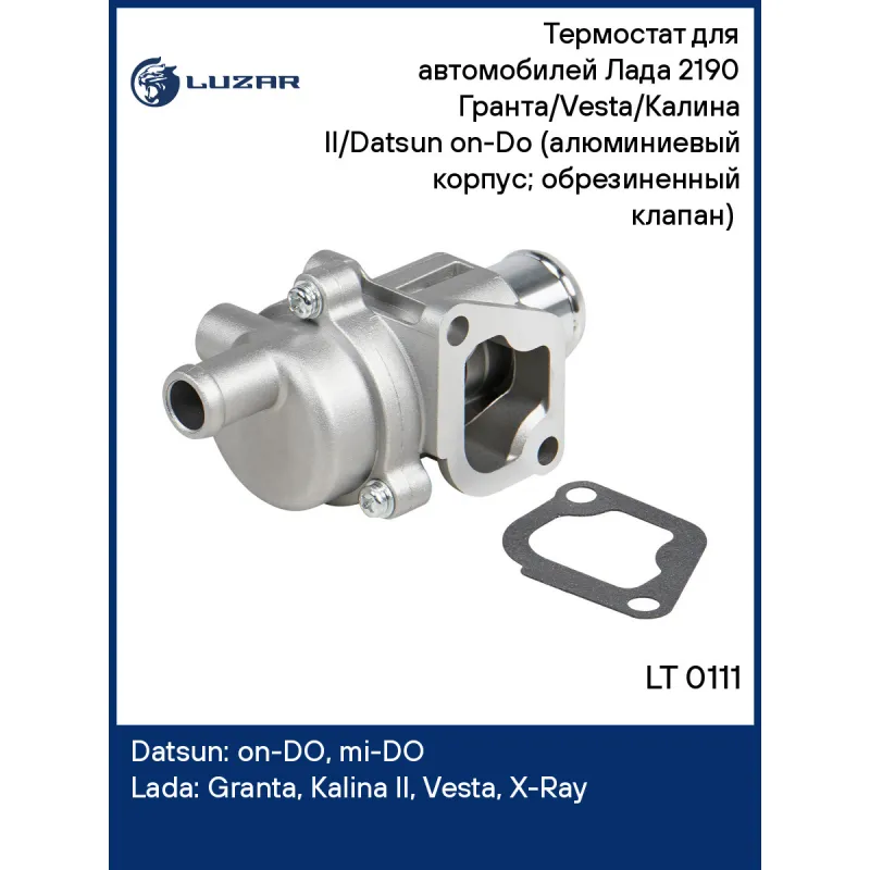 Термостат для автомобилей Лада 2190 Гранта/Vesta/Калина II/Datsun on-Do (алюминиевый корпус; обрезиненный клапан) ("летний" 75°С) Характеристики: Артикул: LT 0111 OEM номера: 2190-1306010, 2190-1306100, 21900-1306010-00, 8450037236, 8450001028, 21200-5PA0A Трансмиссия: MT Температура открытия, ?С: 75 Количество на автомобиль: 1 Комплектация: уплотнительная прокладка Материал корпуса: алюминий Основной клапан: обрезиненный Подходит для авто: Datsun on-DO (14-), mi-DO (15-) ВАЗ Granta (10-), Kalina II (13-), Vesta (15-), X-Ray (15-) Для проверки применяемости отправьте VIN автомобиля через вкладку "Есть вопросы о товаре?" Комплектация: термостат - 1 шт Паспорт изделия - 1 шт Уплотнительная прокладка - 1 шт Гарантия: от 1 года.