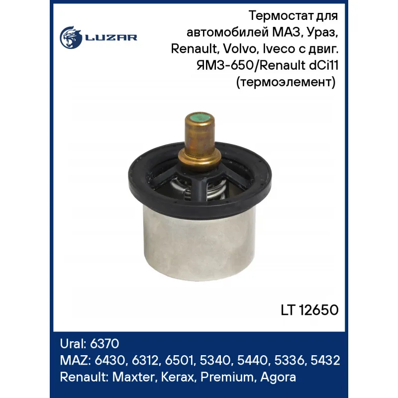 Термостат для автомобилей МАЗ, Ураз, Renault, Volvo, Iveco с двиг. ЯМЗ-650/Renault dCi11 (термоэлемент) (86°С) LT 12650 LUZAR