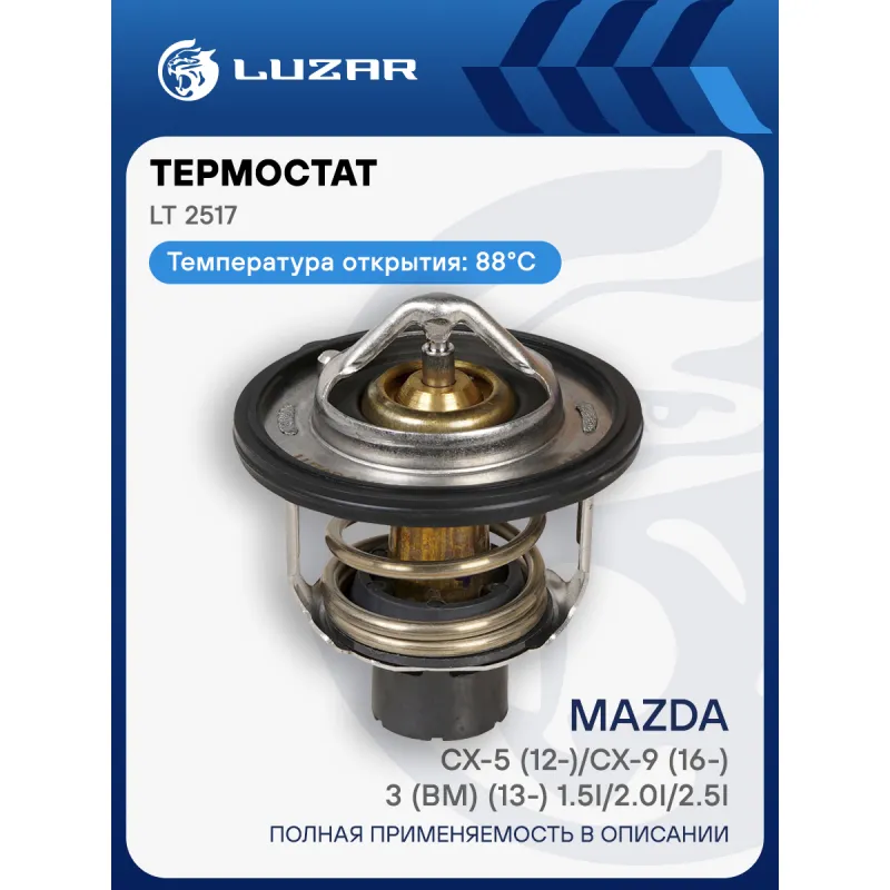 Термостат для автомобилей Mazda CX-5 (12-)/CX-9 (16-)/3 (BM) (13-) 1.5i/2.0i/2.5i (88°C) (термоэлемент) Характеристики: Артикул: LT 2517 OEM номера: P50115171, P50215171 Кондиционер: + Количество на автомобиль: 1 Трансмиссия: AT Температура открытия, ?С: 88 Комплектация: уплотнительная прокладка Основной клапан: обрезиненный Подходит для авто: Mazda CX-5 (17-), CX-5 (12-), CX-5 (17-), 3 (13-) Для проверки применяемости отправьте VIN автомобиля через вкладку "Есть вопросы о товаре?" Комплектация: термостат - 1 шт Паспорт изделия - 1 шт Уплотнительная прокладка - 1 шт Гарантия: от 1 года.