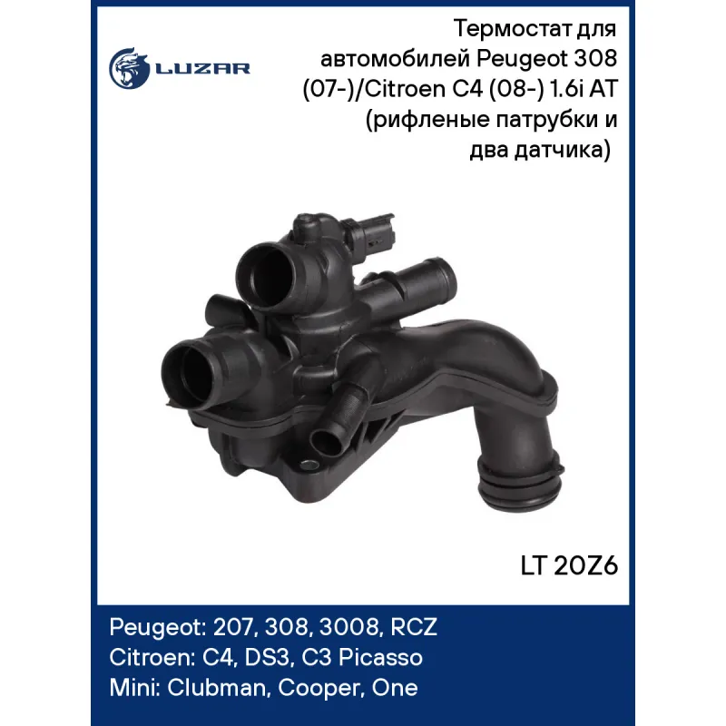 Термостат для автомобилей Peugeot 308 (07-)/Citroen C4 (08-) 1.6i AT (рифленые патрубки и два датчика) (105°С) Характеристики: Артикул: LT 20Z6 OEM номера: 11537534521, 1336.Z6, 9810916980 Количество на автомобиль: 1 Трансмиссия: AT Температура открытия, ?С: 105 Сопутствующий товар: Насосы водяные (помпы): LWP 20Z6 Сопутствующий товар: Радиаторы охлаждения: LRc 11197; LRc 20W2; LRc 2601 Сопутствующий товар: Электровентиляторы охлаждения: LFK 20308 Сопутствующий товар: Блоки охлаждения (радиатор + конденсор + вентилятор): LRK 1197 Сопутствующий товар: Датчики температуры: LS 2006 Комплектация: уплотнительная прокладка Материал корпуса: пластик Патрубок: обыкновенный (не быстросъемный) Дополнительный патрбок: АКПП Датчики: два 2-х контактных (управление + датчик температуры) Вид эксплуатации: электронное управление Примечание: в нашем ассортименте есть модификация данного термостата в алюминиевом корпсуе - LT 2026, а также аналог с пониженной температурой открытия - LT 2006 Подходит для авто: Peugeot 207 (06-), 308 (07-), 3008 (09-), RCZ (10-) Citroen C4 (10-), DS3 (10-), C3 Picasso (09-) Mini Clubman (07-), Cooper (06-), One (09-) Для проверки применяемости отправьте VIN автомобиля через вкладку "Есть вопросы о товаре?" Комплектация: термостат - 1 шт Уплотнительная прокладка - 1 шт Паспорт изделия - 1 шт Гарантия: от 1 года.