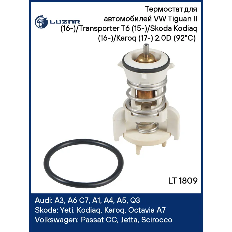 Термостат для автомобилей VW Tiguan II (16-)/Transporter T6 (15-)/Skoda Kodiaq (16-)/Karoq (17-) 2.0D (92°C) (термоэлемент) Характеристики: Артикул: LT 1809 OEM номера: 04L121113C, 04L121113B, 04L121026P, 04L121026L, 04L121026AH, 04L121026AE Количество на автомобиль: 1 Трансмиссия: AT Температура открытия, ?С: 92 Кондиционер: + Двигатель: [CRBC, CRLB, CRUA, DBGA, DCYA, DEJA, CUVC, CUWA, CAAA, CXGA, CAAB, CXGB, CKFC, CRBC, CRLB, CRMB, DFFA, DFGA, DFHA, DBGC, DFGA, DTSB] Комплектация: уплотнительная прокладка Подходит для авто: Audi A3 (12-), A6 C7 (11-), A1 (10-), A4 (15-), A5 (16-), Q3 (11-) Skoda Yeti (09-), Kodiaq (16-), Karoq (17-), Octavia A7 (13-), Superb III (15-) Volkswagen Passat CC (08-), Jetta (11-), Scirocco (08-), Sharan (10-), Transporter T6 (15-), Multivan T6 (15-), Golf VII (12-), Passat B8 (15-), Tiguan (16-) Для проверки применяемости отправьте VIN автомобиля через вкладку "Есть вопросы о товаре?" Комплектация: термостат - 1 шт Паспорт изделия - 1 шт Уплотнительная прокладка - 1 шт Гарантия: от 1 года.