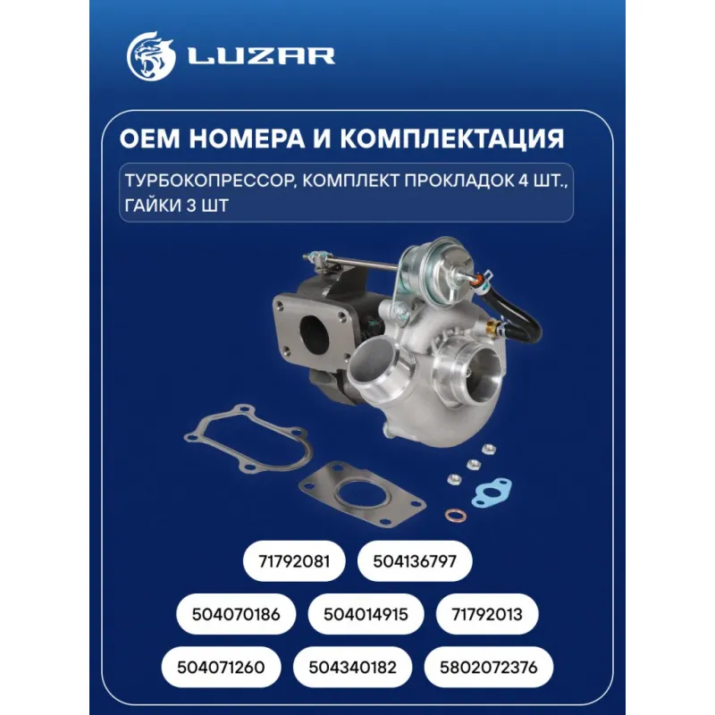 Турбокомпрессор для а/м Fiat Ducato (06-) 2.3TD Характеристики: Артикул: LAT 1680 OEM номера: 504071260, 504340182, 5802072376, 504070186, 504014915, 71792013, 71792081, 504136797 Количество на автомобиль: 1 Тип картриджа: K03 Применение: [F1AE; F1AG; F1CE] Сопутствующий товар: Радиаторы интеркулера (онв): LRIC 1680 Сопутствующий товар: Актуатор: LTC 1680 Сопутствующий товар: Набор монтажный: LTC 16801 Подходит для авто: Iveco Daily IV (06-) Fiat Ducato II (94-) Для проверки применяемости отправьте VIN автомобиля через вкладку "Есть вопросы о товаре?" Комплектация: Турбокомпрессор - 1 шт Комплект прокладок - 4 шт Гайки - 3 шт Паспорт изделия - 1 шт Гарантия: от 1 года.
