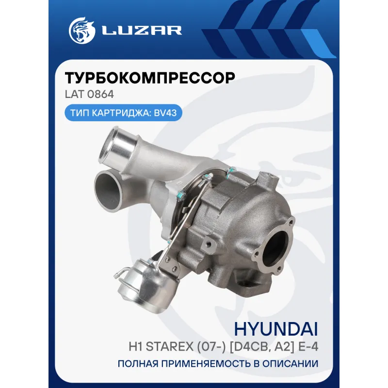 Турбокомпрессор для а/м Hyundai H1 Starex (07-) 2.5D [D4CB, A2] Е-4 (тип BV43) Характеристики: Артикул: LAT 0864 OEM номера: 28200-4A480 Количество на автомобиль: 1 Сопутствующий товар: Актуатор: LTC 0864 Сопутствующий товар: Набор монтажный: LTC 08641 Применяемость: D4CB Подходит для авто: Hyundai Starex (H-1) (07-), H-1 (08-) Для проверки применяемости отправьте VIN автомобиля через вкладку "Есть вопросы о товаре?" Комплектация: Турбокомпрессор - 1 шт Комплект прокладок - 6 шт Паспорт изделия - 1 шт Гарантия: от 1 года.