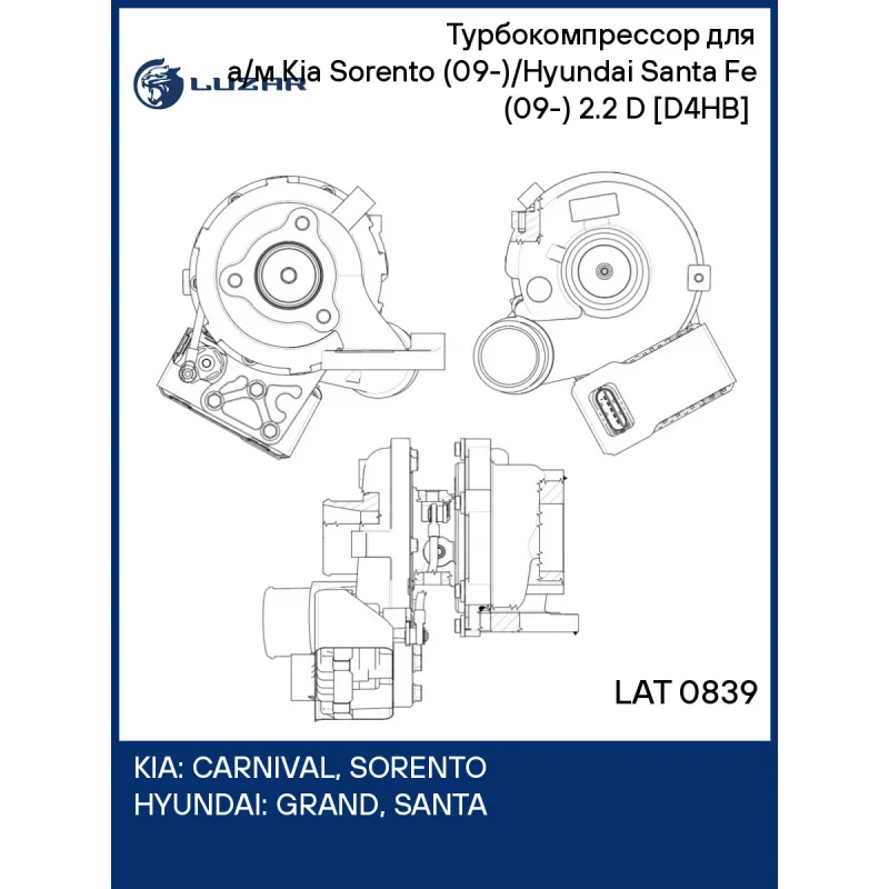 Турбокомпрессор для а/м Kia Sorento (09-)/Hyundai Santa Fe (09-) 2.2 D [D4HB] (тип GTB1752VLK) Характеристики: Артикул: LAT 0839 OEM номера: 28231-2F100 Количество на автомобиль: 1 Тип картриджа: GTB1752VLK Применяемость: D4HB Комплектация: Турбокомпрессор. - 1 шт Комплект прокладок - 5 шт Паспорт изделия. - 1 шт Гарантия: от 1 года.