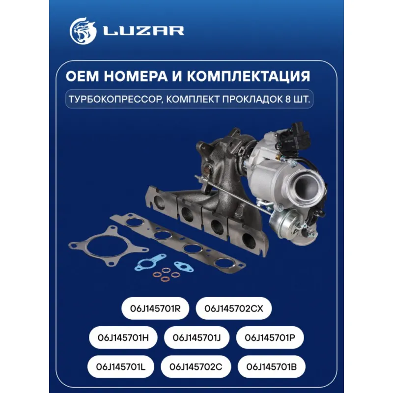 Турбокомпрессор для а/м Skoda Octavia (04-)/VW Passat B6 (05-) 1.8T [BZB;CDAA] Характеристики: Артикул: LAT 1848 OEM номера: 06J145701L, 06J145702C, 06J145701B, 06J145701H, 06J145701J, 06J145701P, 06J145701R, 06J145702CX Количество на автомобиль: 1 Тип картриджа: K03 Применение: [BYT; BZB; CDAA ; CDAB] Сопутствующий товар: Актуатор: LTC 1848 Сопутствующий товар: Набор монтажный: LTC 18481 Сопутствующий товар: Радиаторы интеркулера (онв): LRIC 18N5 Подходит для авто: Volkswagen Golf VI (08-), Passat CC (08-), Passat B6 (05-) Skoda Superb II (08-), Yeti (09-), Octavia A5 (04-) Audi A3 (07-) Seat Leon (05-), Altea (07-), Toledo (04-) Для проверки применяемости отправьте VIN автомобиля через вкладку "Есть вопросы о товаре?" Комплектация: Турбокомпрессор Комплект прокладок - 8 шт Паспорт изделия Гарантия: от 1 года.