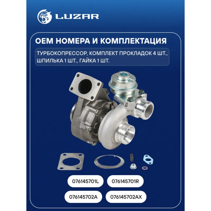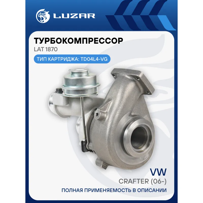 Турбокомпрессор для а/м VW Crafter (06-) 2.5D (тип TD04L4-VG) Характеристики: Артикул: LAT 1870 OEM номера: 076145702A, 076145702AX, 076145701L, 076145701R Количество на автомобиль: 1 Применяемость: BJM, CECB, BJL, CECA, BJK, CEBB Подходит для авто: Volkswagen Crafter (06-) Для проверки применяемости отправьте VIN автомобиля через вкладку "Есть вопросы о товаре?" Комплектация: Турбокомпрессор - 1 шт Комплект прокладок - 4 шт Шпилька - 1 шт Гайка - 1 шт Паспорт изделия - 1 шт Гарантия: от 1 года.