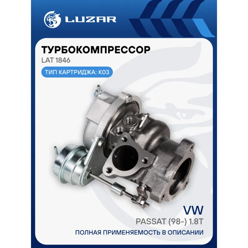Турбокомпрессор для а/м VW Passat (98-) 1.8T (тип К03) Характеристики: Артикул: LAT 1846 OEM номера: 058145703J, 058145703N, 058145703JV, 058145703JX, 058145703NX, 058145703K, 058145703L, 058145703H, 058145703E, 058145703D, 058145703C, 058145703B Количество на автомобиль: 1 Сопутствующий товар: Радиаторы интеркулера (онв): LRIC 1804 Сопутствующий товар: Актуатор: LTC 1846 Сопутствующий товар: Набор монтажный: LTC 18461 Применение: AEB,APU,ANB, AJL Подходит для авто: Audi A4 B5 (94-), A6 C5 (97-) Skoda Superb I (01-) Volkswagen Passat B5 (96-) Для проверки применяемости отправьте VIN автомобиля через вкладку "Есть вопросы о товаре?" Комплектация: Турбокомпрессор - 1 шт Комплект прокладок - 9 шт Паспорт изделия - 1 шт Гарантия: от 1 года.