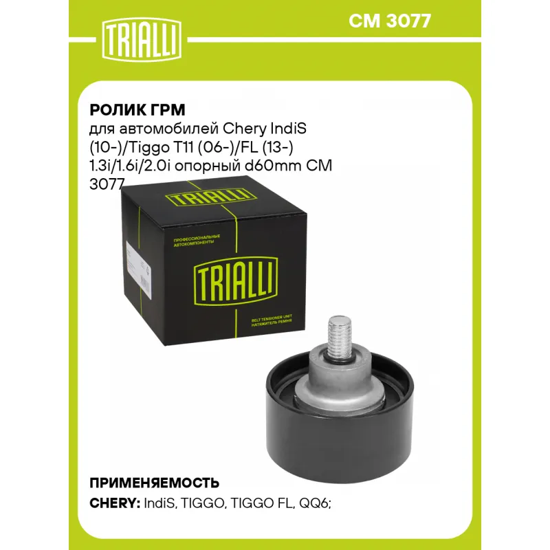 Ролик ГРМ для автомобилей Chery IndiS (10-)/Tiggo T11 (06-)/FL (13-) 1.3i/1.6i/2.0i опорный d60mm Характеристики: Артикул: CM 3077 OEM номера: 481H-1007070BA, 481H1007070, 481H1007070BA Гарантийный срок: 2 года/60 000 км. Сопутствующий товар: Ролики ГРМ: CM 3013, CM 6365, CM 3002 Количество на автомобиль: 1 Материал: Комбинированный Внешний диаметр, мм: 60 Внутренний диаметр, мм: 10 Ширина, мм: 30 Товарная линейка: BLACK Комплектация: Ролик ГРМ - 1 шт Гарантия: от 1 года.