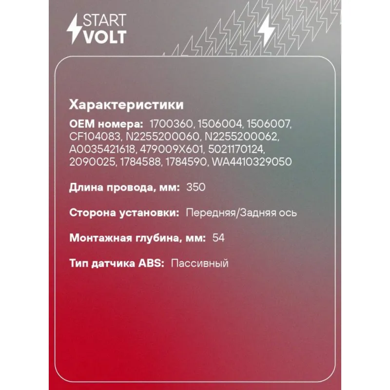 Датчик ABS для автомобилей КАМАЗ/DAF/MAN/Scania прямой 350мм Характеристики: Артикул: VS-ABS 0708 OEM номера: 1700360, 1506004, 1506007, CF104083, N2255200060, N2255200062, A0035421618, 479009X601, 5021170124, 2090025, 1784588, 1784590, WA4410329050, 4240468, WA4410329632, 99707007090, 4410329050, 4410329632, 505820819, 1000451 Сторона установки: Передняя/Задняя ось Длина провода, мм: 350 Тип датчика ABS: Пассивный Монтажная глубина, мм: 54 Подходит для авто: КамаАЗ 43253, 43255, 53229, 65115, 65116, 6540, 4308, 5490, 65117, 6520, 65201, 53215, 54115, 5460, 6460, 65206, 6560, 54901, 43253, 43255, 55111, 55111, 65115, 65116, 65116, 6540, 6540, 4308, 4308, 6520, 6520, 6520, 54115, 5460, 6460 Для проверки применяемости отправьте VIN автомобиля через вкладку "Есть вопросы о товаре?" Комплектация: Паспорт изделия/гарантийный талон - 1 шт Датчик ABS - 1 шт Смазка литиевая многофункциональная STARTVOLT (стик 5г) - 1 шт Установочная втулка - 1 шт Гарантия: от 1 года.