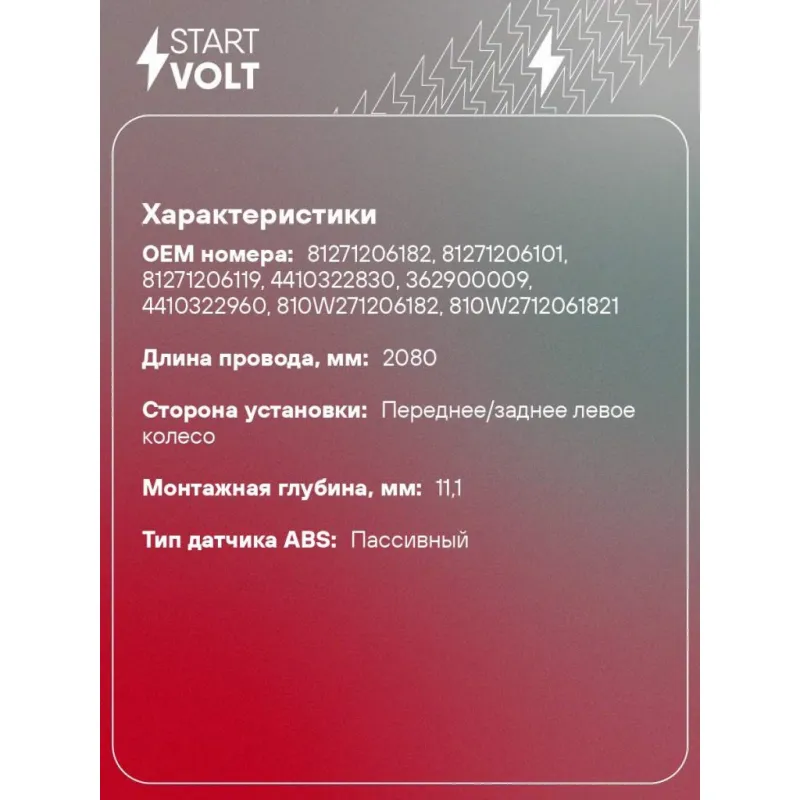 Датчик ABS для автомобилей MAN TGS (05-)/TGA (99-) переднего/заднего левого колеса Характеристики: Артикул: VS-ABS 1606 OEM номера: 81271206182, 81271206101, 81271206119, 4410322830, 362900009, 4410322960, 810W271206182, 810W2712061821 Длина провода, мм: 2080 Сторона установки: Переднее/заднее левое колесо Монтажная глубина, мм: 11,1 Тип датчика ABS: Пассивный Подходит для авто: MAN TGA (00-), TGS (07-) Для проверки применяемости отправьте VIN автомобиля через вкладку "Есть вопросы о товаре?" Комплектация: Паспорт изделия/гарантийный талон - 1 шт Датчик ABS - 1 шт Гарантия: от 1 года.