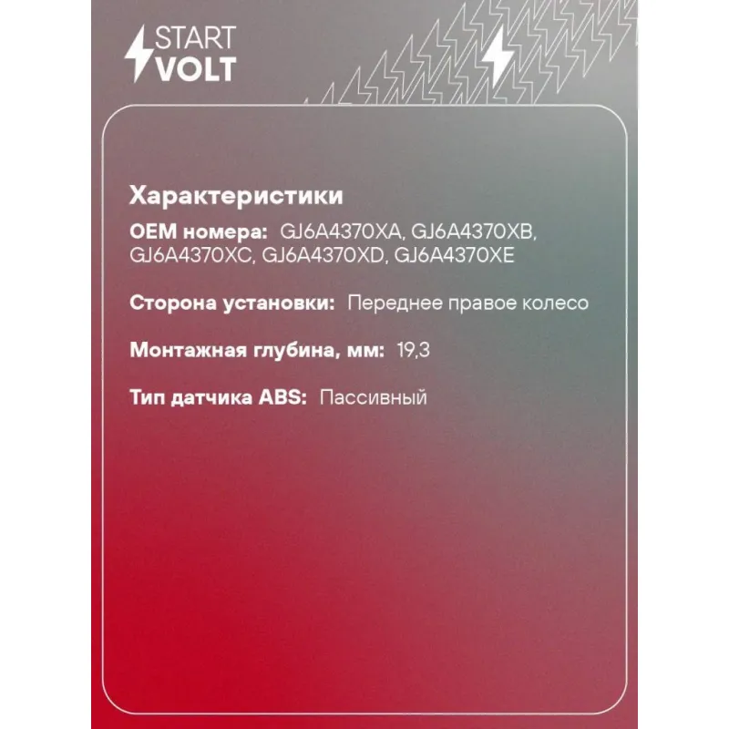 Датчик ABS для автомобилей Mazda 6 GG (02-) переднего правого колеса Характеристики: Артикул: VS-ABS 2509 OEM номера: GJ6A4370XA, GJ6A4370XB, GJ6A4370XC, GJ6A4370XD, GJ6A4370XE Сторона установки: Переднее правое колесо Монтажная глубина, мм: 19,3 Тип датчика ABS: Пассивный Комплектация: Датчик ABS - 1 шт Паспорт изделия/гаран... Читать полностью →