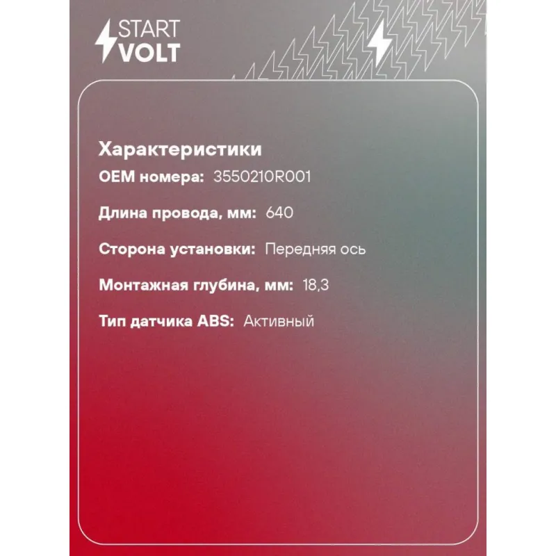 Датчик ABS для автомобилей Sollers Atlant (22-)/JAC Sunray (20-) переднего левого/правого колеса Характеристики: Артикул: VS-ABS 2123 OEM номера: 3550210R001 Длина провода, мм: 640 Сторона установки: Передняя ось Монтажная глубина, мм: 18,3 Тип датчика ABS: Активный Комплектация: Датчик ABS - 1 шт Паспорт изделия/гарантийный ... Читать полностью →