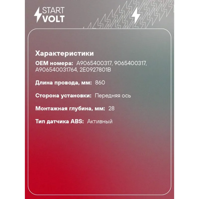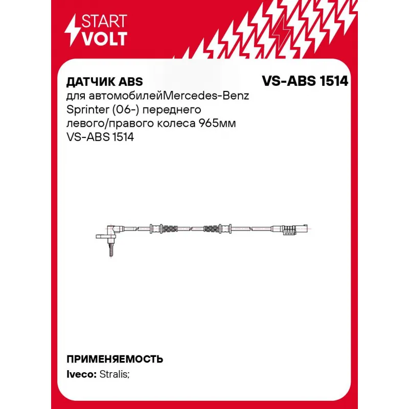 Датчик ABS для автомобилей Mercedes-Benz Sprinter (06-) переднего левого/правого колеса 965мм Характеристики: Артикул: VS-ABS 1514 OEM номера: A9065400317, 9065400317, A906540031764, 2E0927801B Длина провода, мм: 860 Сторона установки: Передняя ось Монтажная глубина, мм: 28 Тип датчика ABS: Активный Подходит для авто: Iveco S... Читать полностью →