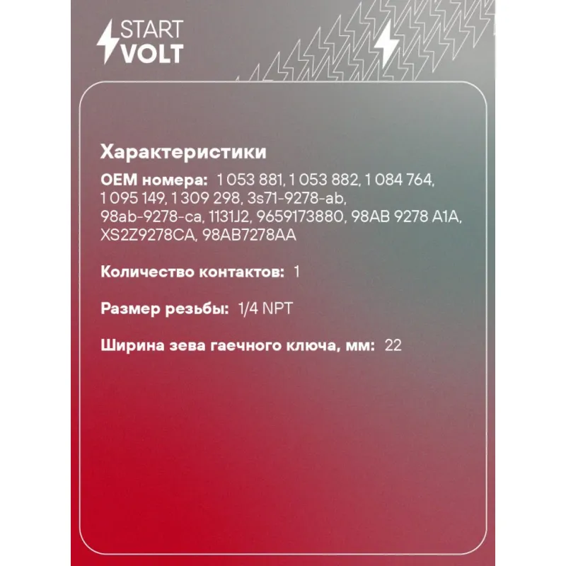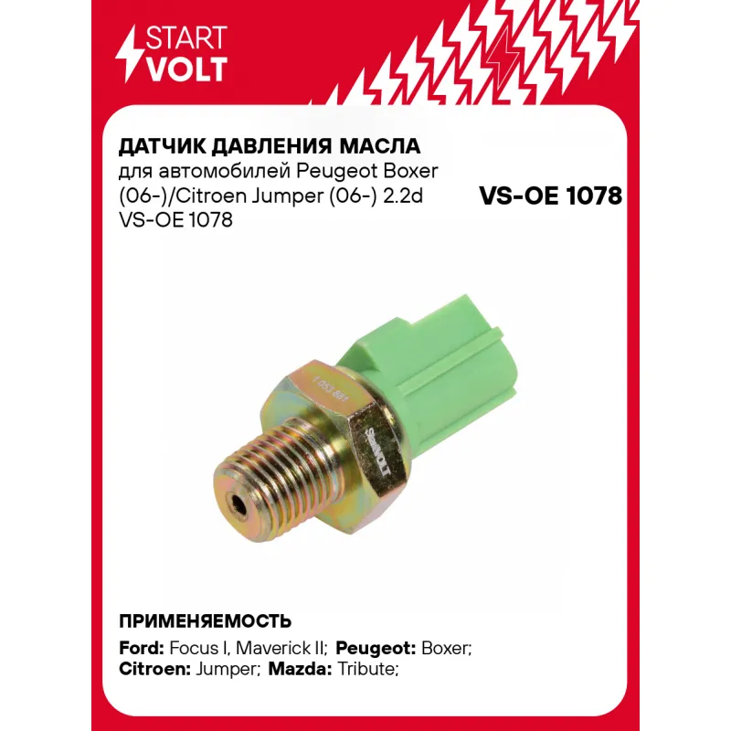 Датчик давления масла для автомобилей Peugeot Boxer (06-)/Citroen Jumper (06-) 2.2d Характеристики: Артикул: VS-OE 1078 OEM номера: 1 053 881, 1 053 882, 1 084 764, 1 095 149, 1 309 298, 3s71-9278-ab, 98ab-9278-ca, 1131J2, 9659173880, 98AB 9278 A1A, XS2Z9278CA, 98AB7278AA, 98AB 9278 A2A, 98AB9278AA, 3S719278A, XS2Z9278AA, 3S719278AA, 8S2Z9278AA, 1 363 198, LR004410, YF09-18-501, U202-18-501 Напряжение, В: 12 Количество на автомобиль: 1 Подходящий разъем AIRLINE:: AECC061 Давление, БАР: 0.4 Размер резьбы: 1/4 NPT Ширина зева гаечного ключа, мм: 22 Количество контактов: 1 Подходит для авто: Ford Focus I (98-), Maverick II (00-) Peugeot Boxer (06-) Citroen Jumper (06-) Mazda Tribute (00-) Для проверки применяемости отправьте VIN автомобиля через вкладку "Есть вопросы о товаре?" Комплектация: Датчик аварийного давления масла - 1 шт Паспорт изделия/гарантийный талон - 1 шт Гарантия: от 1 года.