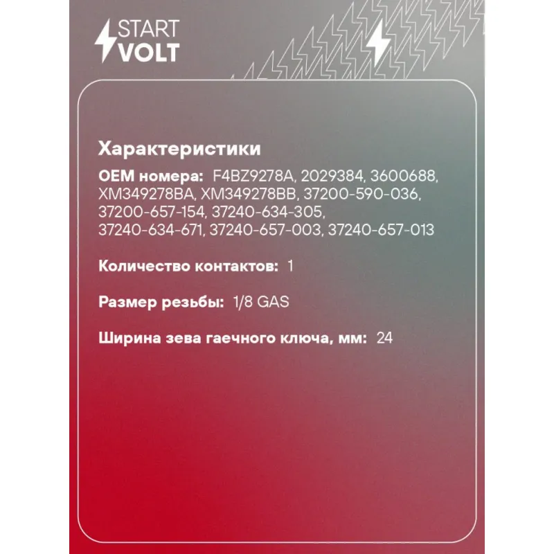 Датчик давления масла для автомобилей Hyundai Accent II (ТагАЗ) (99-) 1.5i/Getz (02-) 1.4i Характеристики: Артикул: VS-OE 0890 OEM номера: F4BZ9278A, 2029384, 3600688, XM349278BA, XM349278BB, 37200-590-036, 37200-657-154, 37240-634-305, 37240-634-671, 37240-657-003, 37240-657-013, 37240-PCX-003, 37240-PI3-003, 37600-611-154, 37240-657-305, 37240-P13-003, 37240-P13-004, 37240-P13-013, 37240-P13-014, 37240-PA6-004, 0222-18-501A, 1345-18-501, B366-18-501, B367-18-501, B36718501A, FS11-18-501A, FS11-18-50X, JE48-18-501A, R207-18-501, 1258A002, 1258A003, 1258A005, MC840219, MD001482, MD001483, MD017430, MD021566, MD138993, MD138994, MD355645, 25240-89911, 25240-T5500, 25240-KA020, 25240-KA050, 25240-KA080, 25240KA040, 25240KA041, 25240KA100, 37820-82001, 3782080G01, 42995-5500, 42995-7000, 37820-80001, 37820-82002, 3782073000, 3782073001, 3782082000, 3782082003, 37820820P0, 83530-02030, 83530-10020, 83530-12020, 83530-12040, 83530-14010, 83530-14020, 83530-30043, 83530-30080, 83530-60040, 83530-14030, 83530-14040, 83530-14050, 83530-28030, 83530-30030, 83530-30041, 9475021030, 94750-42000, 94750-21020, 94750-21010, 5751017700, 94610-73011, 94750-11010, 94750-21000, 94750-35010, 94750-35020, 94750-35030, 94750-31000, 0K71E18501, 0K900-18501C, 0K90018501, 0K90118501, 0 986 345 008, 0 986 345 017, 0 986 345 001, 94580327, 96408134, 91112377, GPS124 Напряжение, В: 12 Количество на автомобиль: 1 Давление, БАР: 0.4 Размер резьбы: 1/8 GAS Ширина зева гаечного ключа, мм: 24 Количество контактов: 1 Подходит для авто: Hyundai Solaris I (10-), Solaris II (17-), Creta (16-), iX35 (10-) Kia Sportage III (10-), Sportage IV (16-) Для проверки применяемости отправьте VIN автомобиля через вкладку "Есть вопросы о товаре?" Комплектация: Датчик аварийного давления масла - 1 шт Паспорт изделия/гарантийный талон - 1 шт Гарантия: от 1 года.