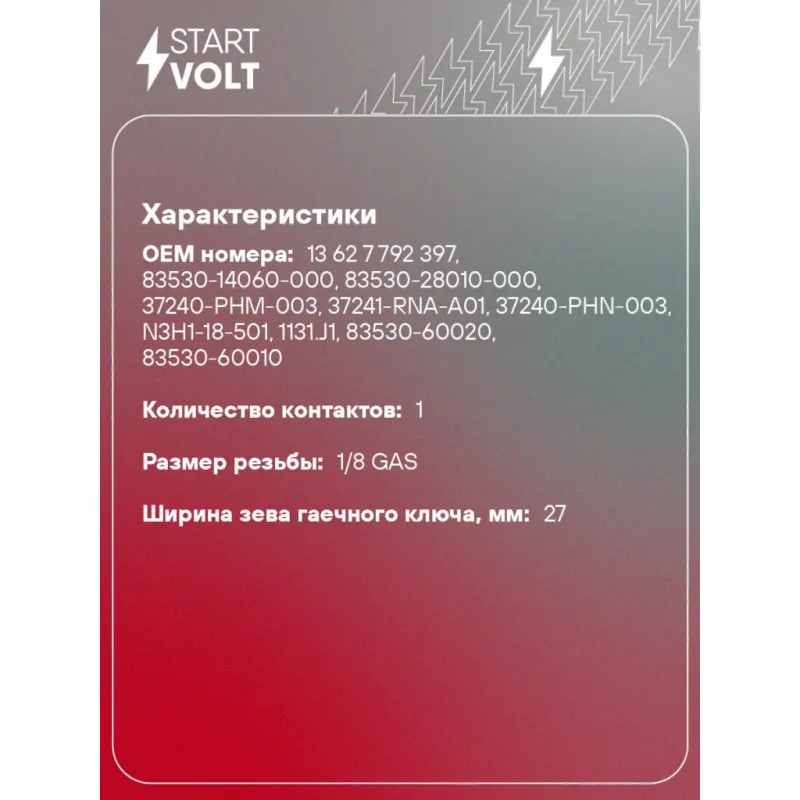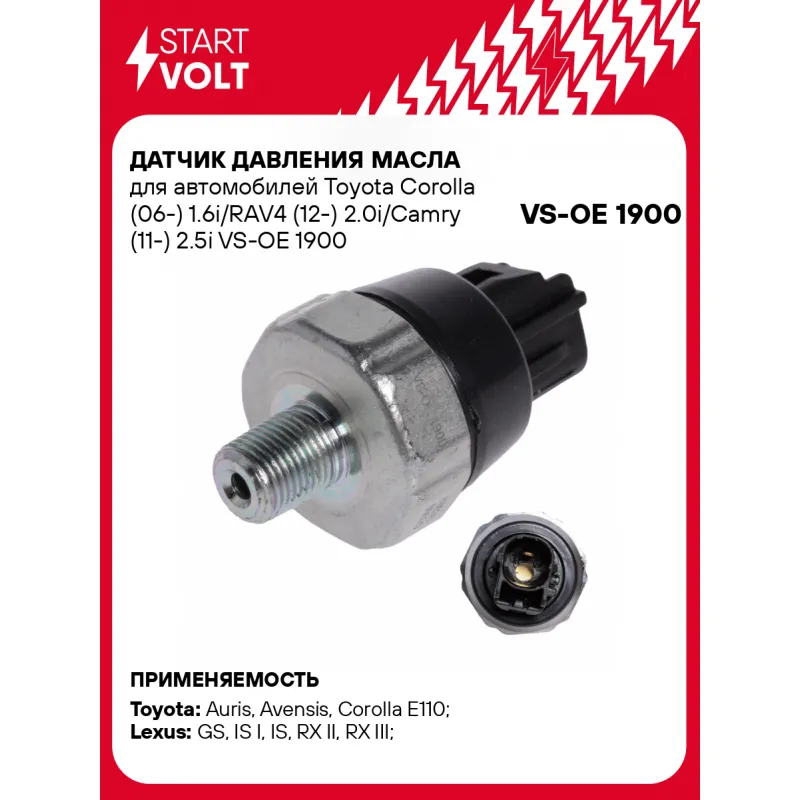 Датчик давления масла для автомобилей Toyota Corolla (06-) 1.6i/RAV4 (12-) 2.0i/Camry (11-) 2.5i Характеристики: Артикул: VS-OE 1900 OEM номера: 13 62 7 792 397, 83530-14060-000, 83530-28010-000, 37240-PHM-003, 37241-RNA-A01, 37240-PHN-003, N3H1-18-501, 1131.J1, 83530-60020, 83530-60010, 83530-28010, 83530-14070, 83530-30100, 83530-AA011, 83530-12050, 83530-57103, 83530-12070, 83530-20010, 83530-12060, 83530-57201, 83530-50050, 83530-28020, 83530-30090, 83530-05010, 83530-14060, 83530-0E010, 83530-20030, 30713497, 30874788, 94 854 295, 94859102 Напряжение, В: 12 Количество на автомобиль: 1 Подходящий разъем AIRLINE:: AECC015, AECC343 Давление, БАР: 0.2 Размер резьбы: 1/8 GAS Ширина зева гаечного ключа, мм: 27 Количество контактов: 1 Подходит для авто: Toyota Auris (06-), Avensis (97-), Avensis (97-), Corolla E110 (95-), Corolla E120 (01-), Yaris (99-), Yaris (99-), Auris (06-), Auris (06-), Carina E (92-), Corolla E120 (01-) Lexus GS (97-), IS I (99-), IS (05-), RX II (03-), RX III (09-), LS 400 (94-) Для проверки применяемости отправьте VIN автомобиля через вкладку "Есть вопросы о товаре?" Комплектация: Датчик аварийного давления масла - 1 шт Паспорт изделия/гарантийный талон - 1 шт Гарантия: от 1 года.